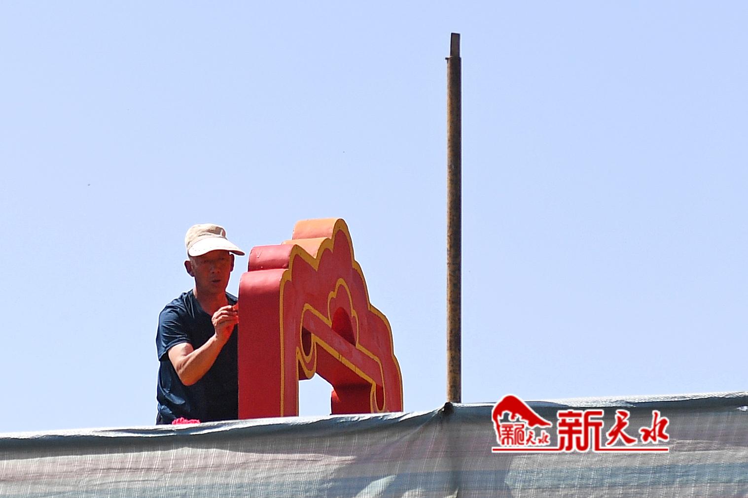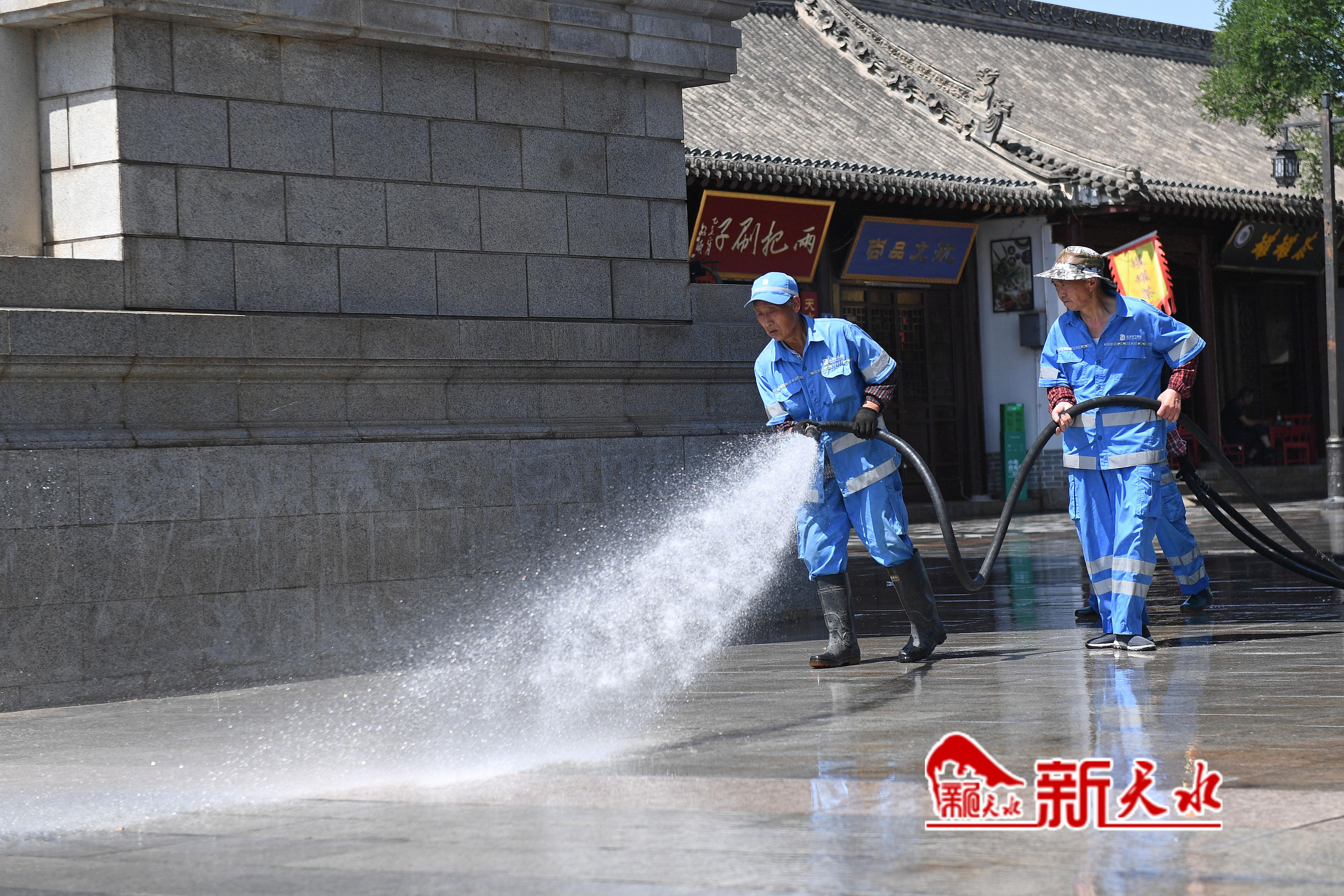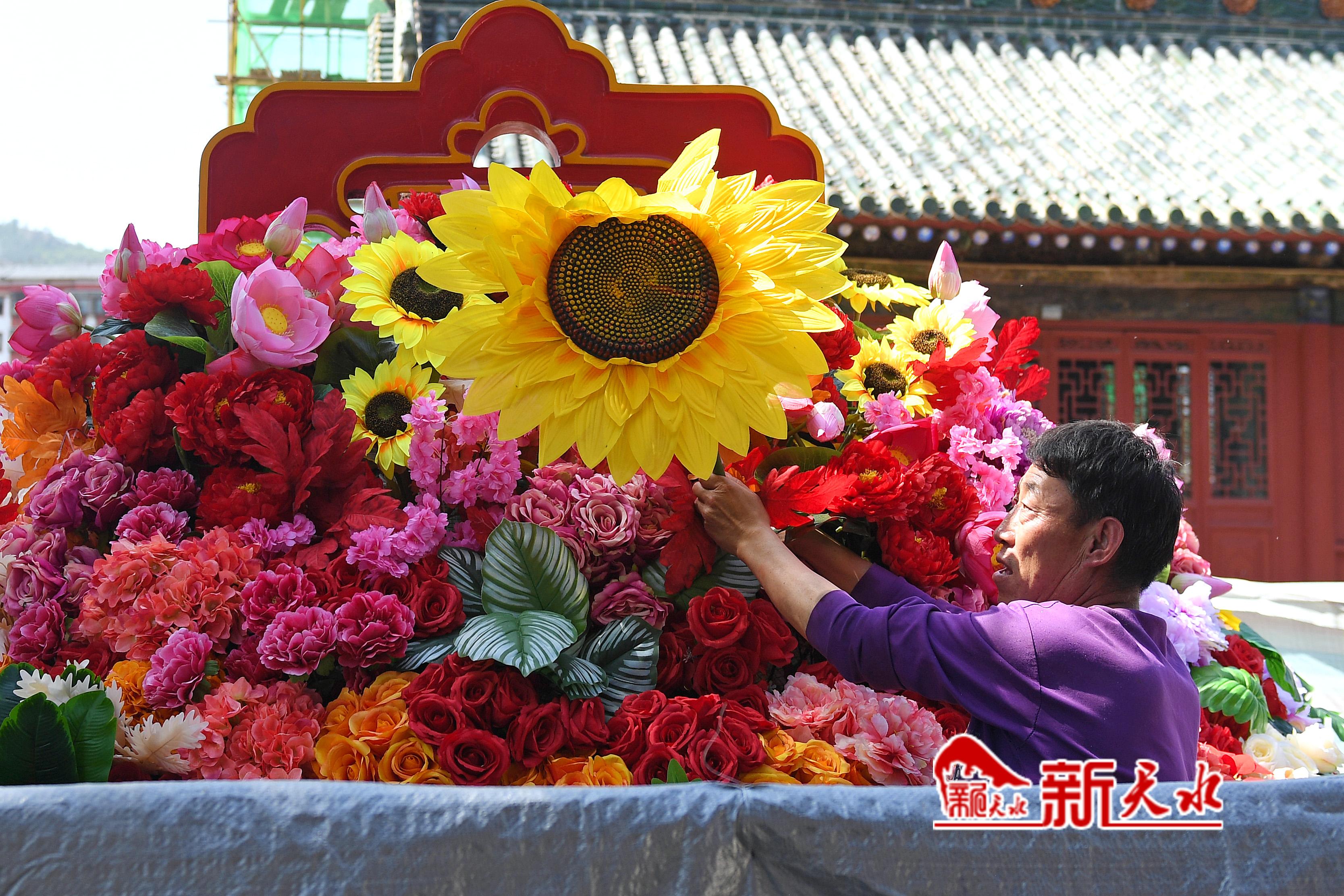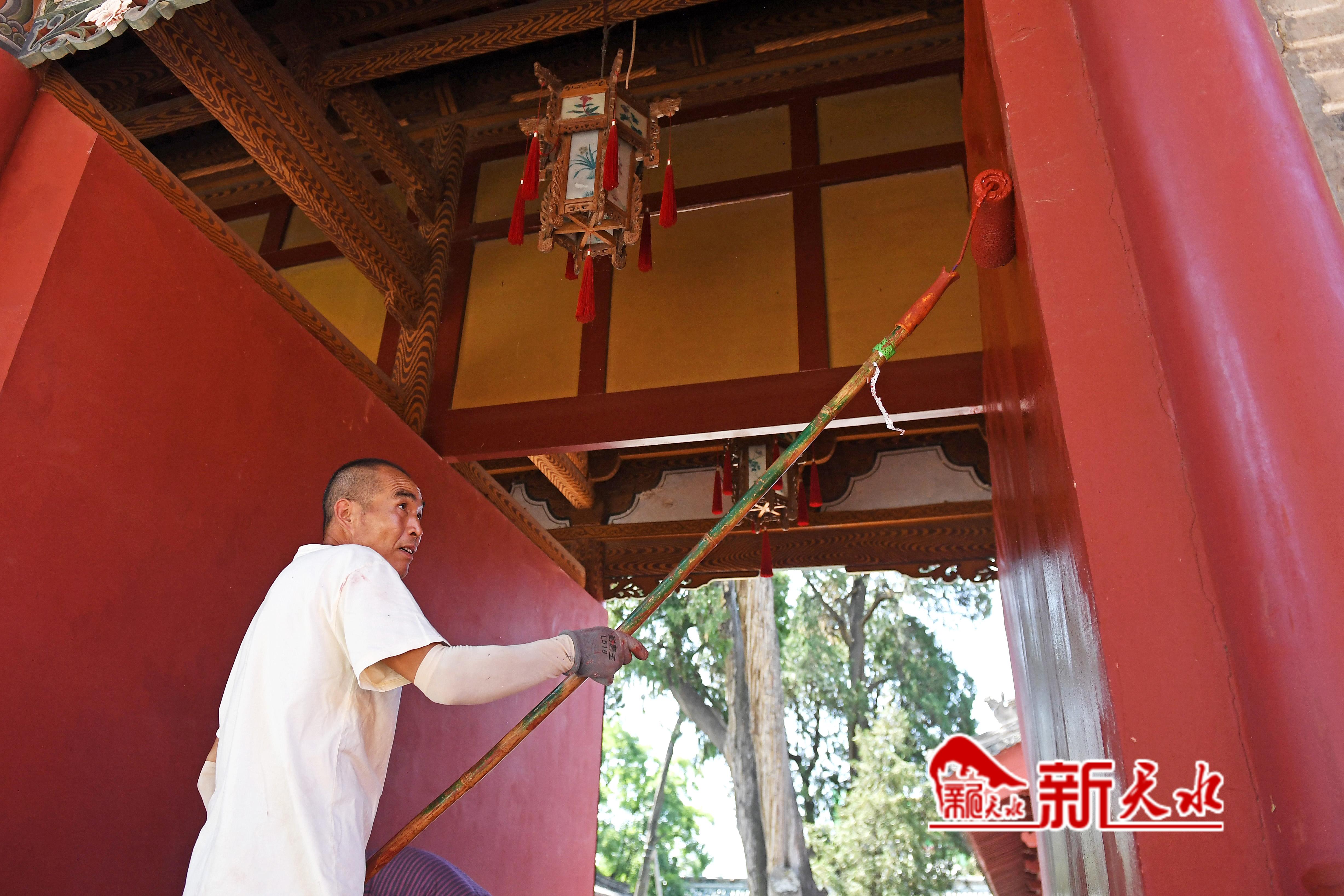 天水伏羲城、伏羲庙内一派繁忙景象:环卫工清洗地面,油漆工粉刷墙面和大型花篮,安装工人设置景区指示牌、布置花篮。