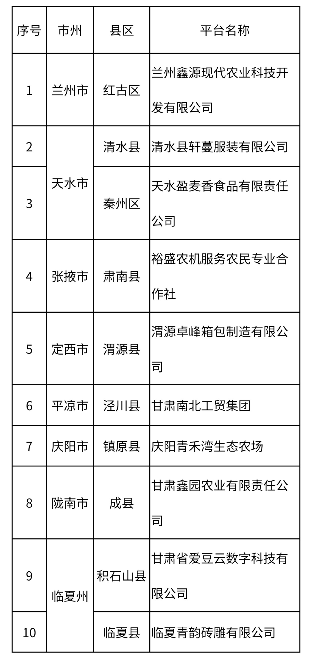 2025年优秀甘肃省农民工返乡创业平台拟认定名单(10个)
