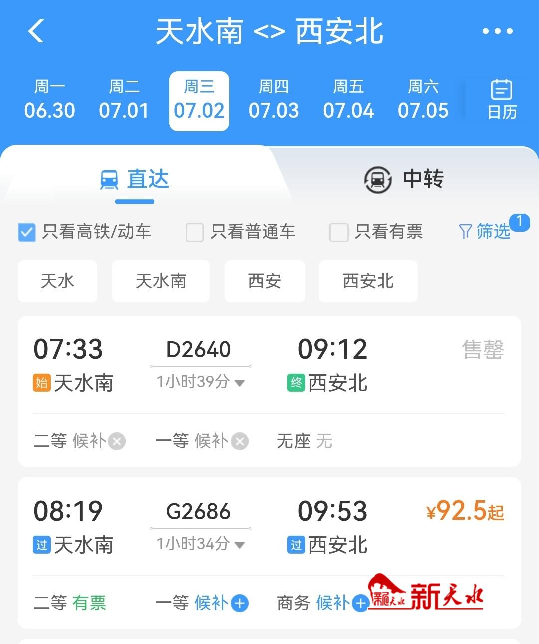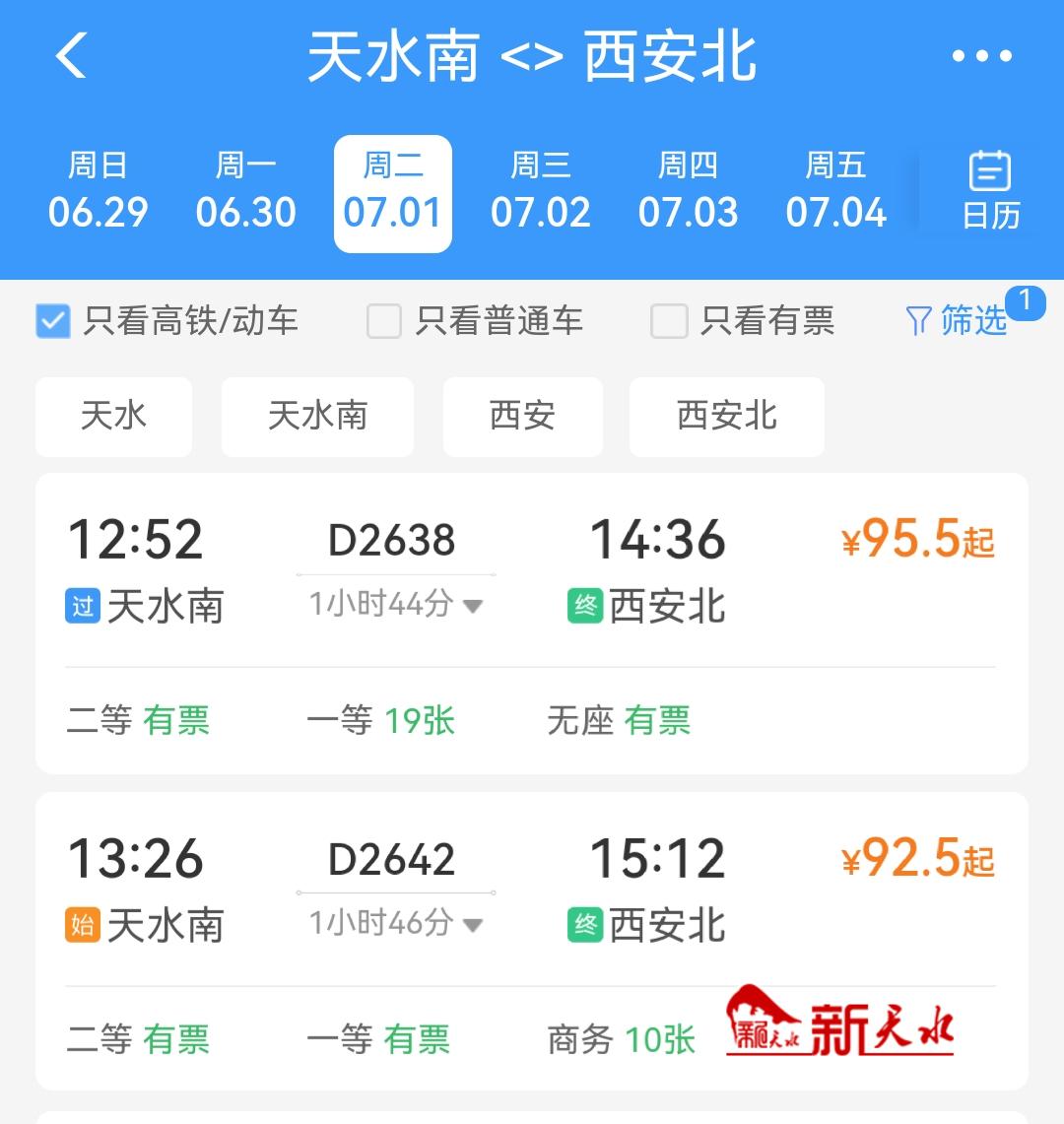 记者通过查询了解到,第一趟天水南至西安北的列车为D2640次列车,天水始发时间为7:33,终到时间为9:12;第二趟为天水南至西安北的D2642次列车,始发时间为13:26,终到15:12。西安北至天水南的第一趟D2641次列车,11:19始发,13:06终到天水;第二趟西安北至天水南的D2639次列车,20:38始发,22:30终到天水。7月2日,天水南至西安北的D2640次列车车票已经售罄。