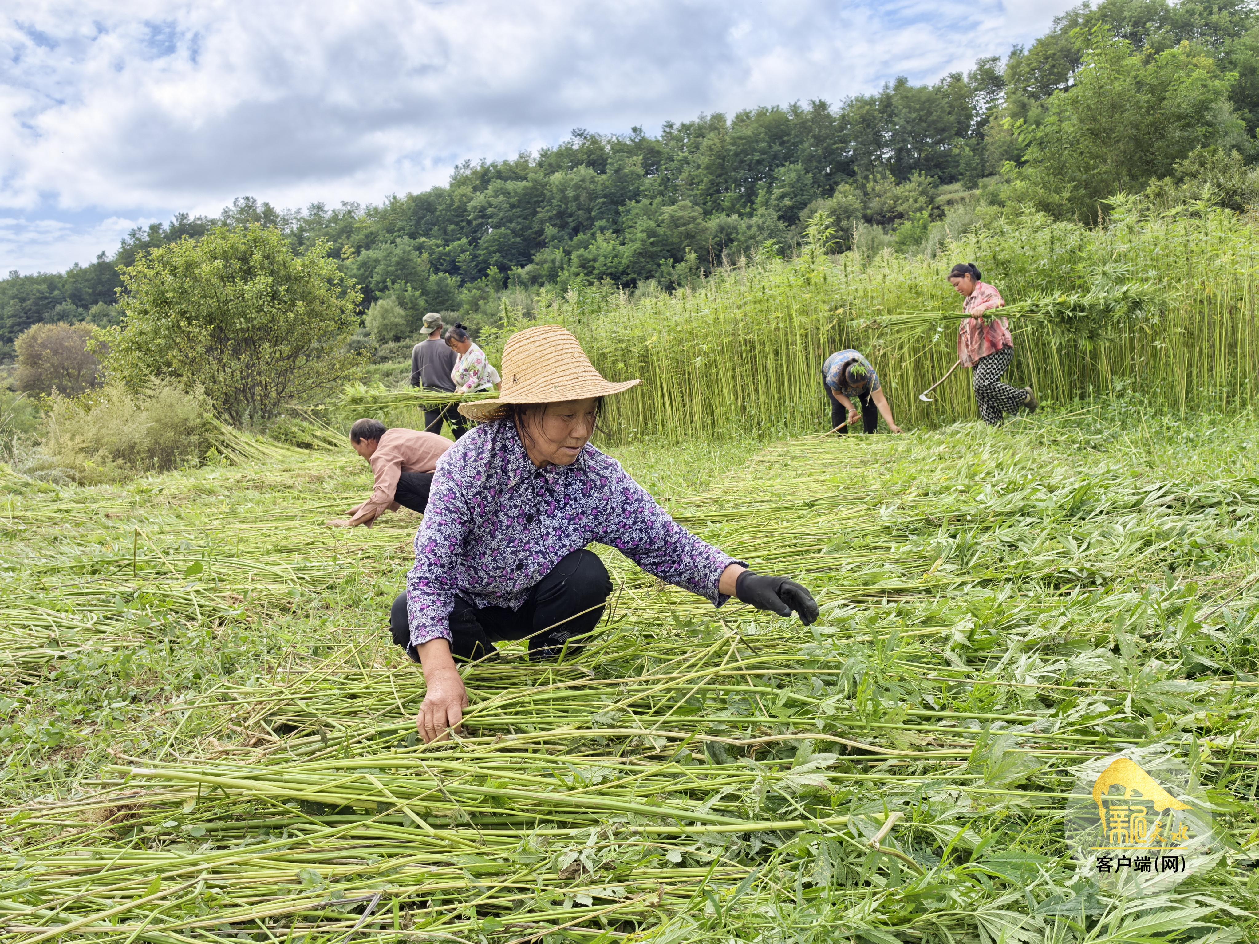在食用菌种植基地,工人们采收蘑菇、木耳,分拣装箱。在连片的汉麻田里,一人多高的麻秆长势喜人,农民们手持镰刀,熟练地进行收割。