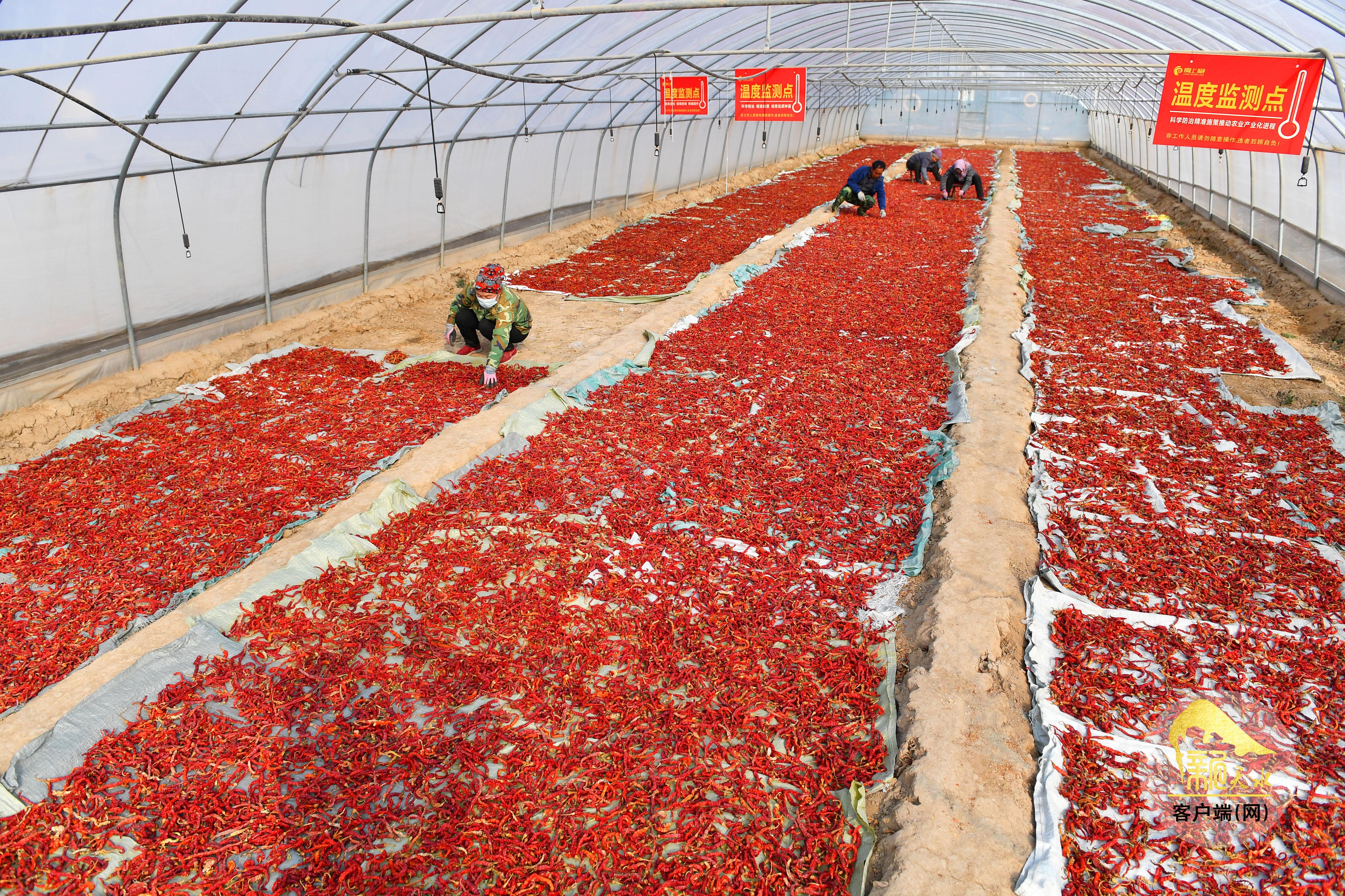 在辣椒种植基地,采摘的红辣椒铺成一片进行晾晒。农民们迎来了一年好收成。近年来,天水大力发展农业产业,通过建设现代设施农业、标准化基地、现代农业园区等举措,各县区特色农业产业有效带动农民增收致富,并助力乡村振兴。(新天水记者 周文涛 孙镇 曹润彬 邓妍)