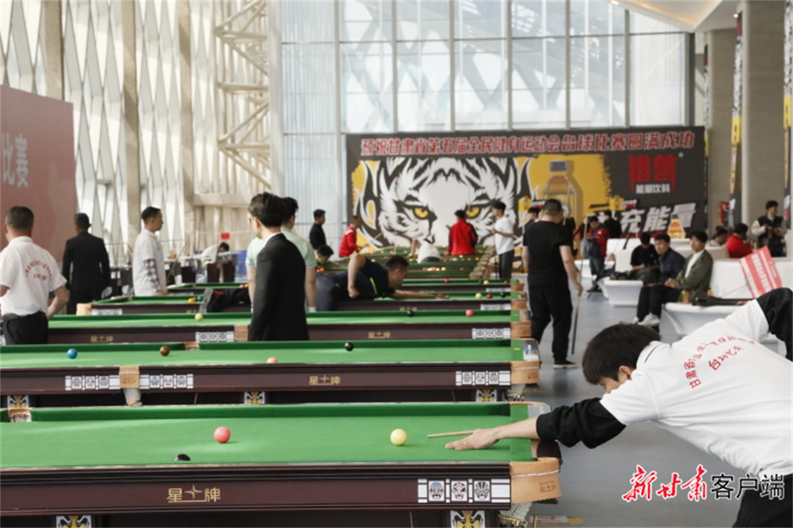 今年4月,甘肃省第五届全民健身运动会台球比赛现场。