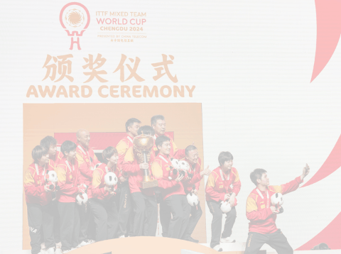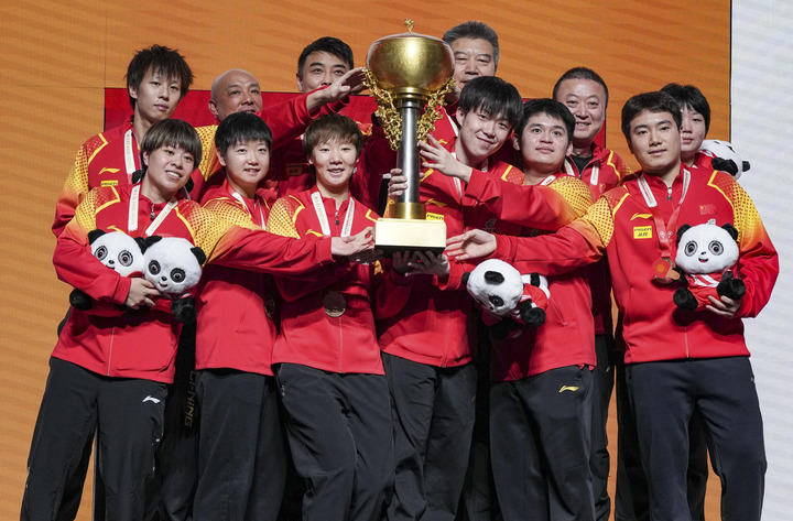 在四川成都举行的2024年国际乒联混合团体世界杯颁奖仪式,中国队获得冠军后合影(资料图)。