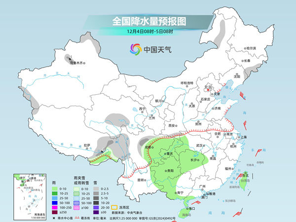 具体来看,中央气象台预计,今天,内蒙古东部、黑龙江东北部、吉林东部、辽东半岛、山东半岛北部、新疆南疆南部、西藏北部和东部、青海中部和东南部、甘肃南部、陕西南部、川西高原等地部分地区有小到中雪或雨夹雪,其中,西藏东部局地有大雪;西藏东南部、西南地区东部、湖北西部、湖南中北部、广西南部、海南岛、台湾岛等地部分地区有小到中雨。