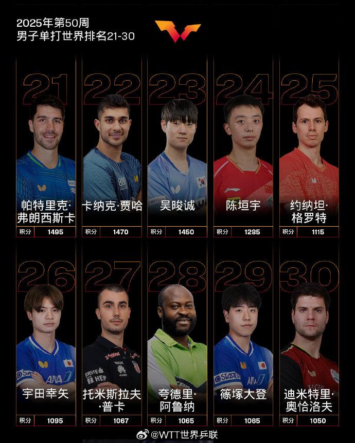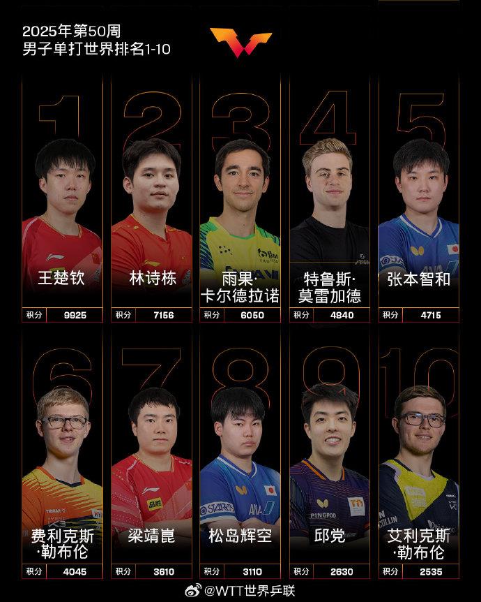 12月9日,国际乒联公布2025年第50周世界排名。
