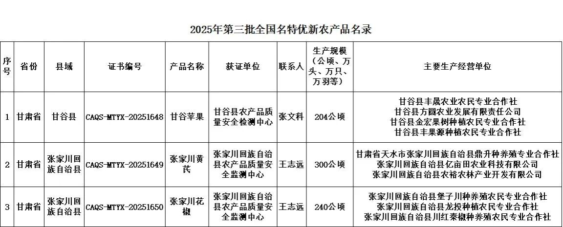 天水市3个农产品入选2025年第三批全国名特优新农产品名录