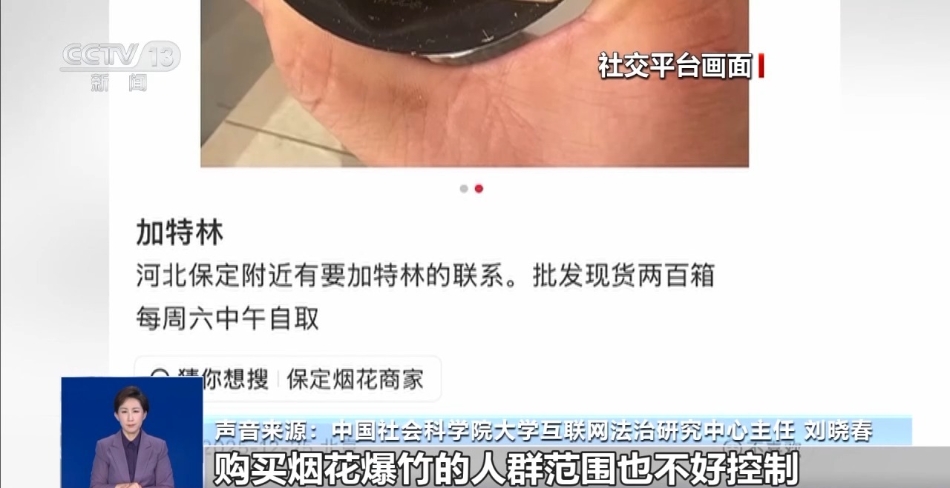 北京航空航天大学法学院副教授 赵精武:在公开社交平台大量转发此类信息,可能会构成情节严重的情形,比如促成大量的烟花爆竹交易的活动,又例如烟花爆竹导致他人人身财产损害,这里边本身可能就涉及协助非法经营活动,就需要承担相应的法律责任。