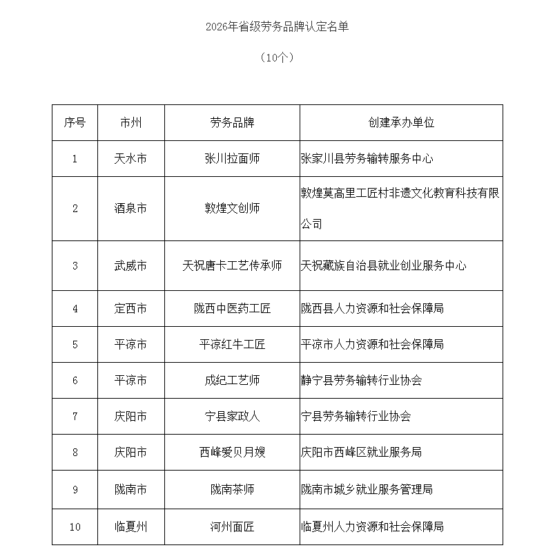 据了解,为培育特色劳务品牌,持续推进农民工返乡创业工作,增强农村劳动力内生动力和发展能力,甘肃省人力资源和社会保障厅联合省财政厅开展了2026年省级劳务品牌及农民工返乡创业平台申报工作。经材料审核、专家评审、实地考察和社会公示等程序,最终认定10个劳务品牌为2026年省级劳务品牌,其中张家川县劳务输转服务中心创建的“张川拉面师”成功入选。同时,18家企业(单位)被认定为2026年甘肃省农民工返乡创业平台,清水县创意巧手工艺品农民专业合作社、秦安县闫家沟农业专业合作社名列其中。对此次认定的省级劳务品牌和农民工返乡创业平台,甘肃省将按规定给予资金补助。