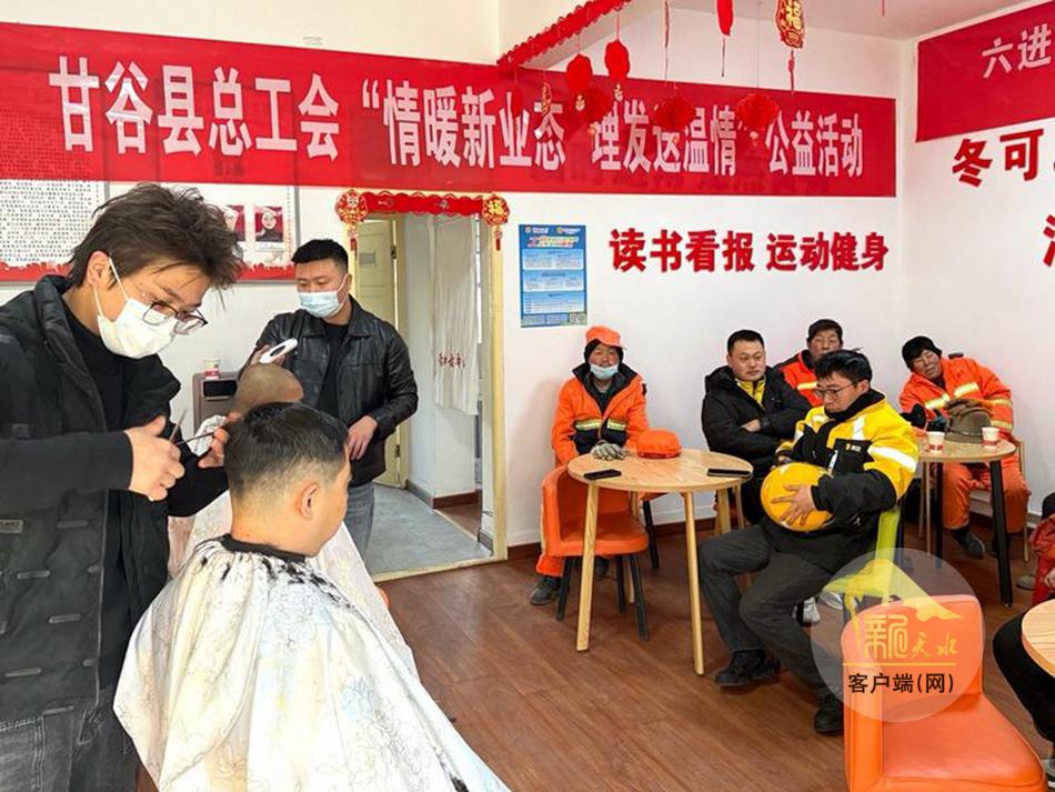 新天水讯 1月13日,甘谷县总工会邀请志愿者理发师在新就业形态劳动者驿站,开展“情暖新业态、理发送温情”公益活动,以切实做好新就业形态劳动者关心关爱工作,传递工会组织的关怀与温暖,解决环卫工人、外卖员等新业态劳动者日常理发不便的问题。