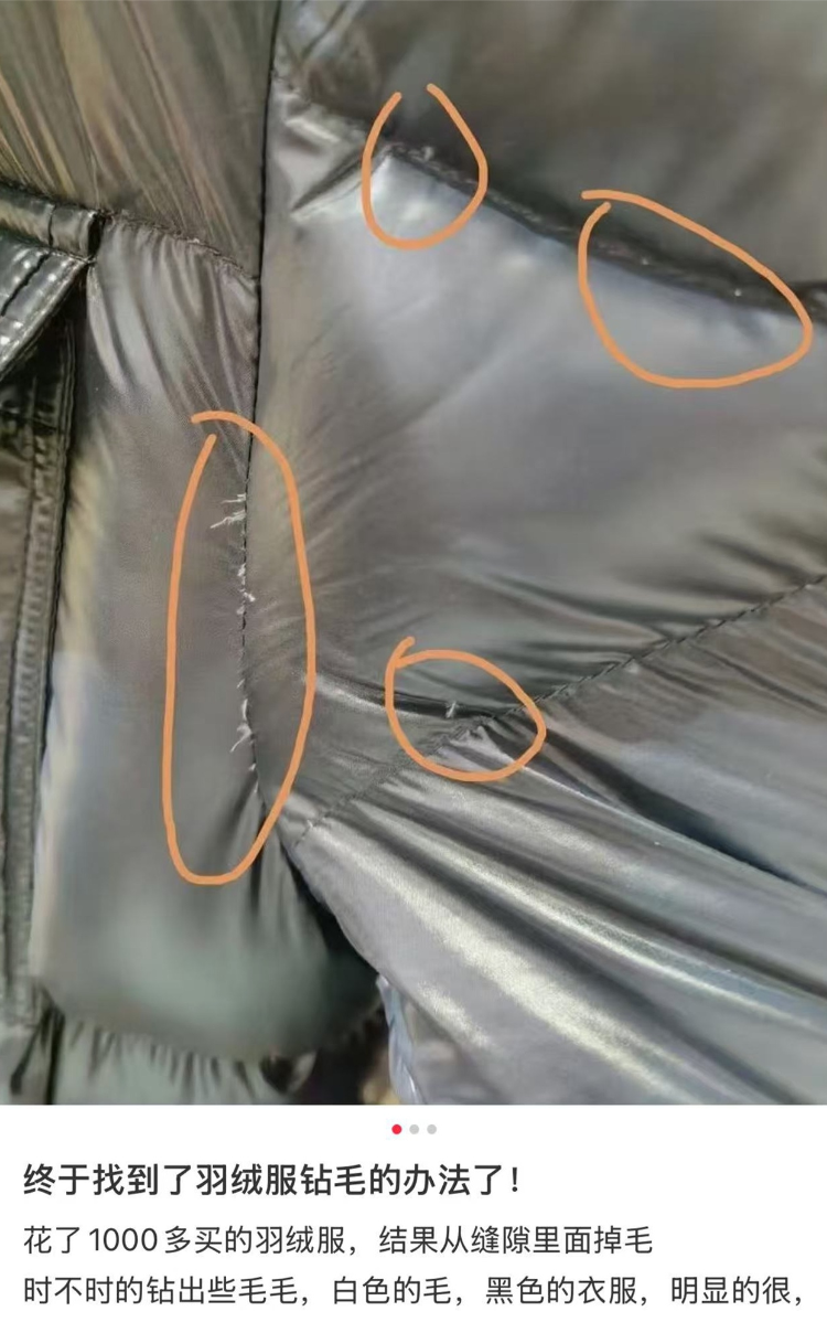 本该光洁利落的羽绒服面料,却有小小的尖尖钻出来,用手一抽,就是一朵绒毛,这不仅影响美观,有时甚至会引起皮肤不适,还会让我们心里不爽——羽绒服不便宜,这下充的绒子又偷偷逃跑变少了……