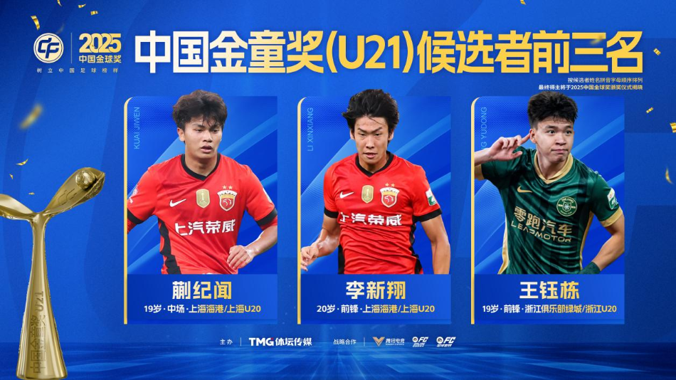 22日,2025年中国金球奖各奖项前三名正式出炉,在U23亚洲杯征战阵容中的两名球员入围U21金童奖前三。