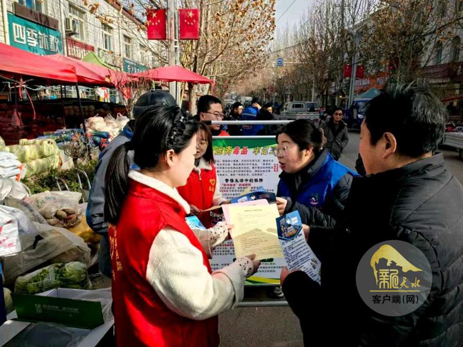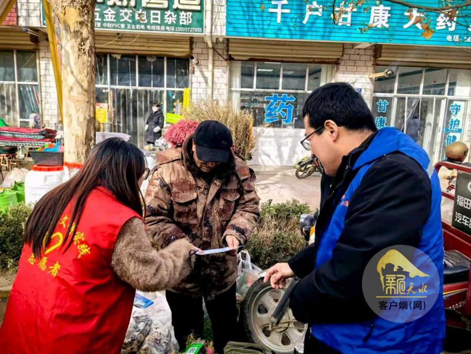 新天水讯 近日,秦安县千户镇组织全镇网格员与新时代文明实践志愿者,在镇区主要街道、年货集市及人员聚集区开展“禁种铲毒”与“反诈防骗”主题宣传活动,为喜庆祥和的节日氛围增添了一道“平安锁”。