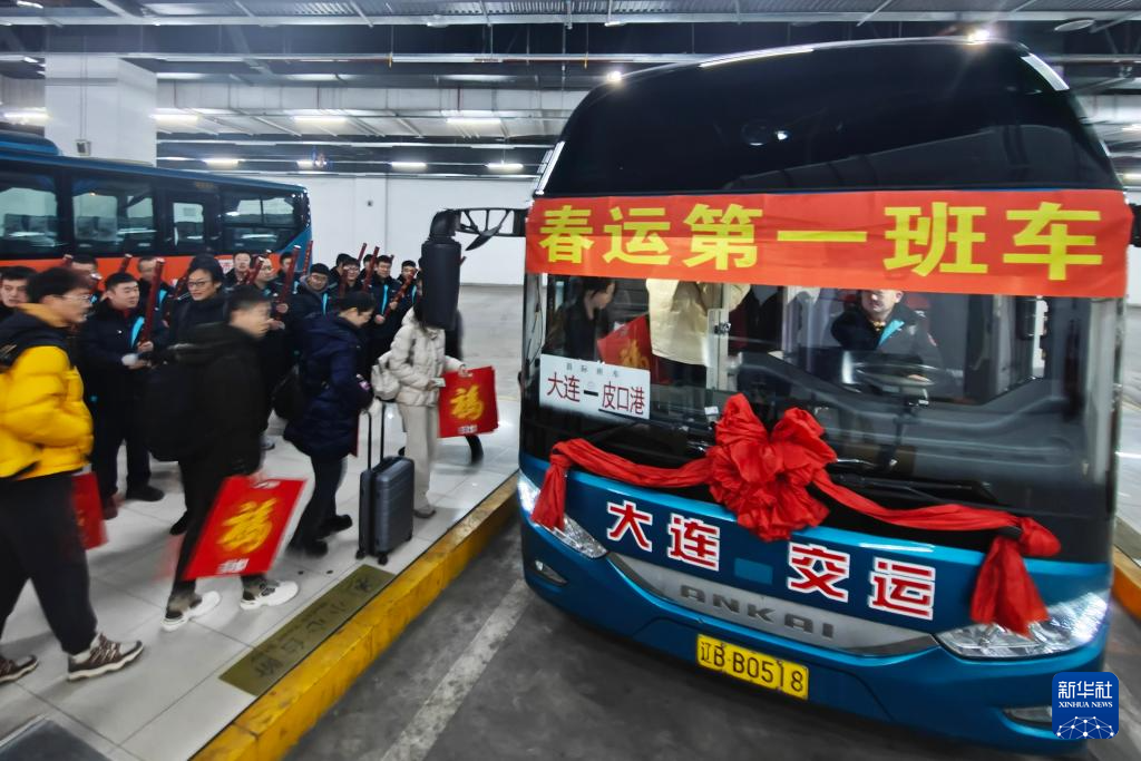 2月2日清晨,旅客在辽宁大连长途汽车站乘坐大连交运集团“春运第一班车”返乡。