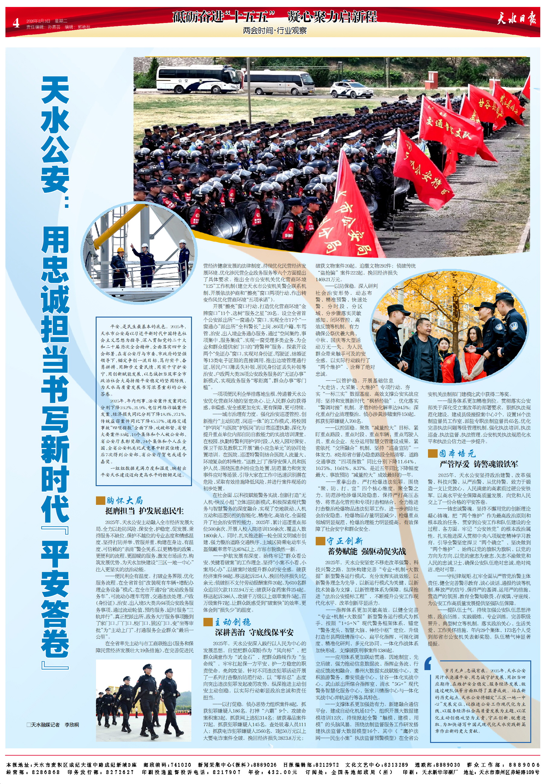 2025年,天水公安坚持政治建警、改革强警、科技兴警、从严治警、从优待警,致力于锻造一支让党放心、人民满意的高素质过硬公安铁军,以高水平安全保障高质量发展,向党和人民交上了一份合格的平安答卷。