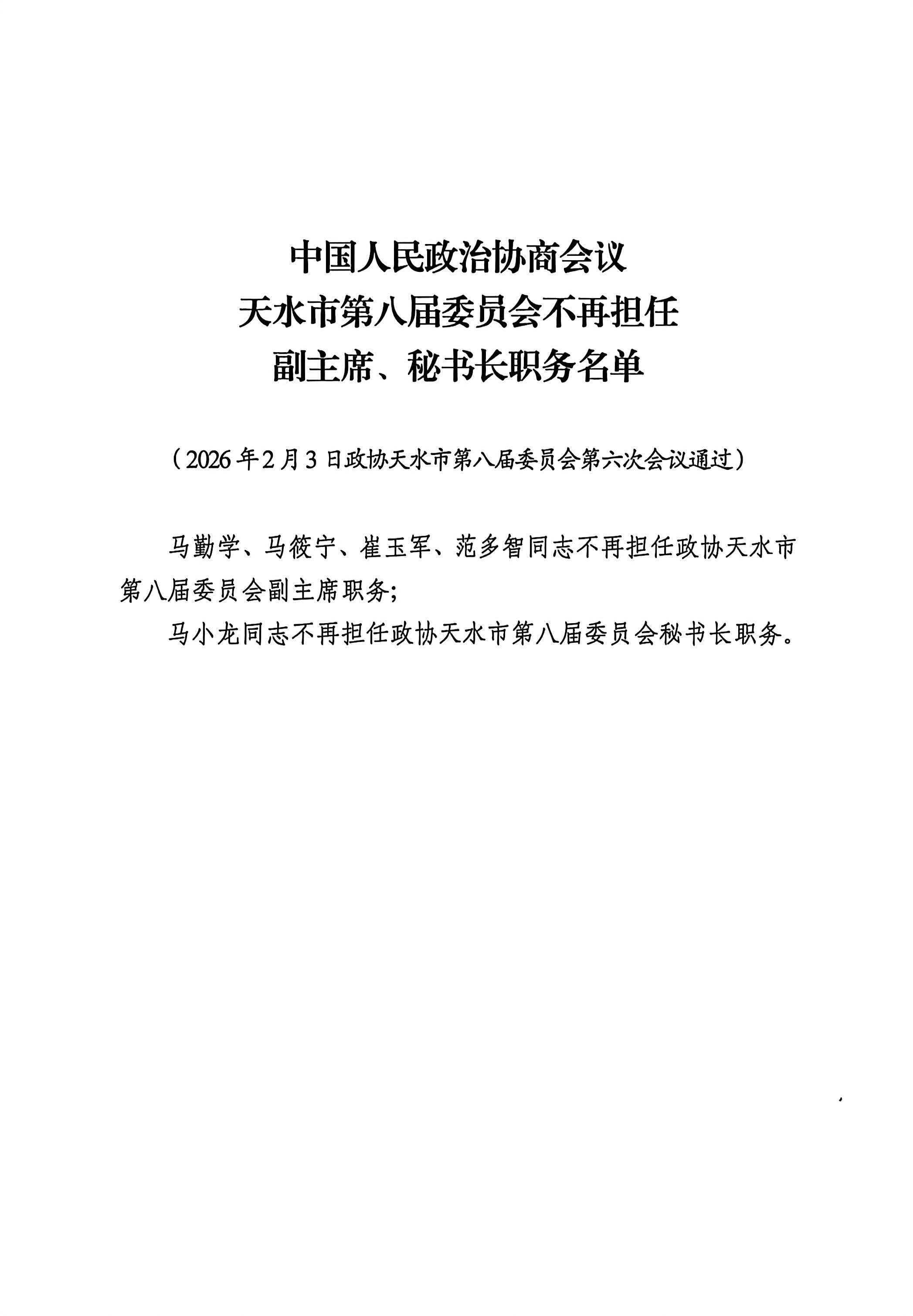 中国人民政治协商会议天水市第八届委员会不再担任副主席、秘书长职务名单