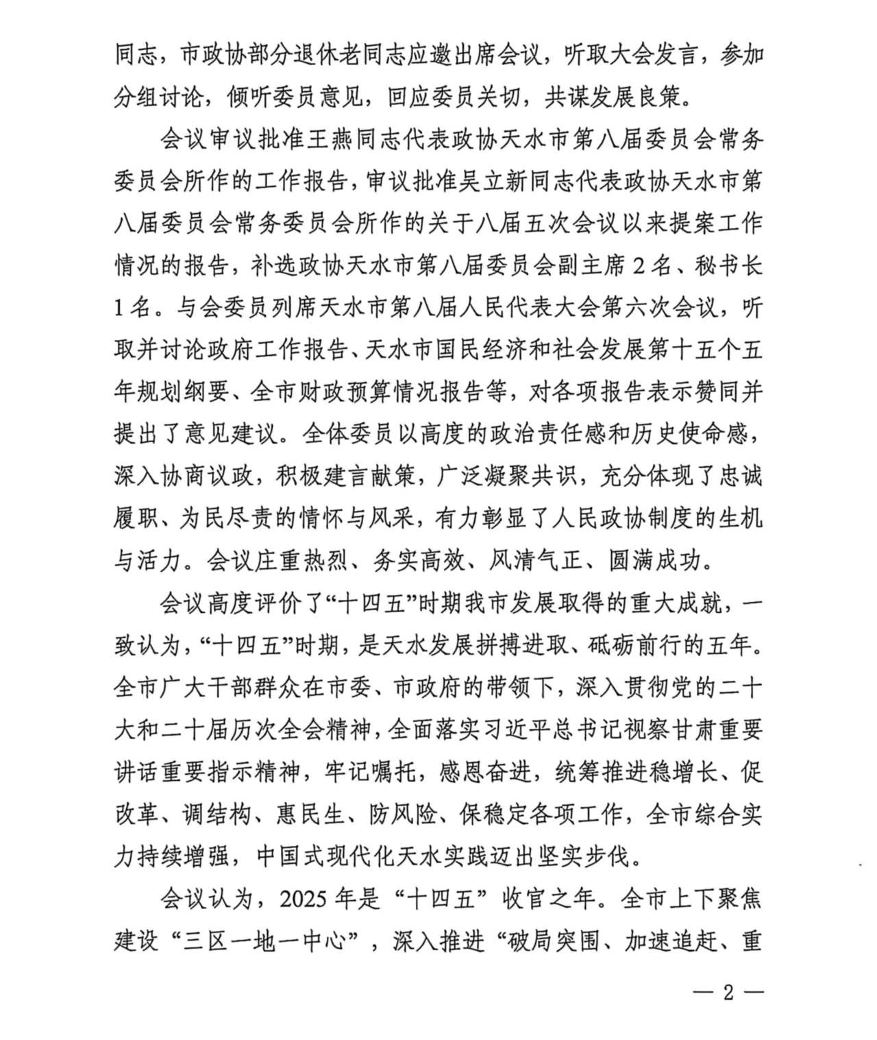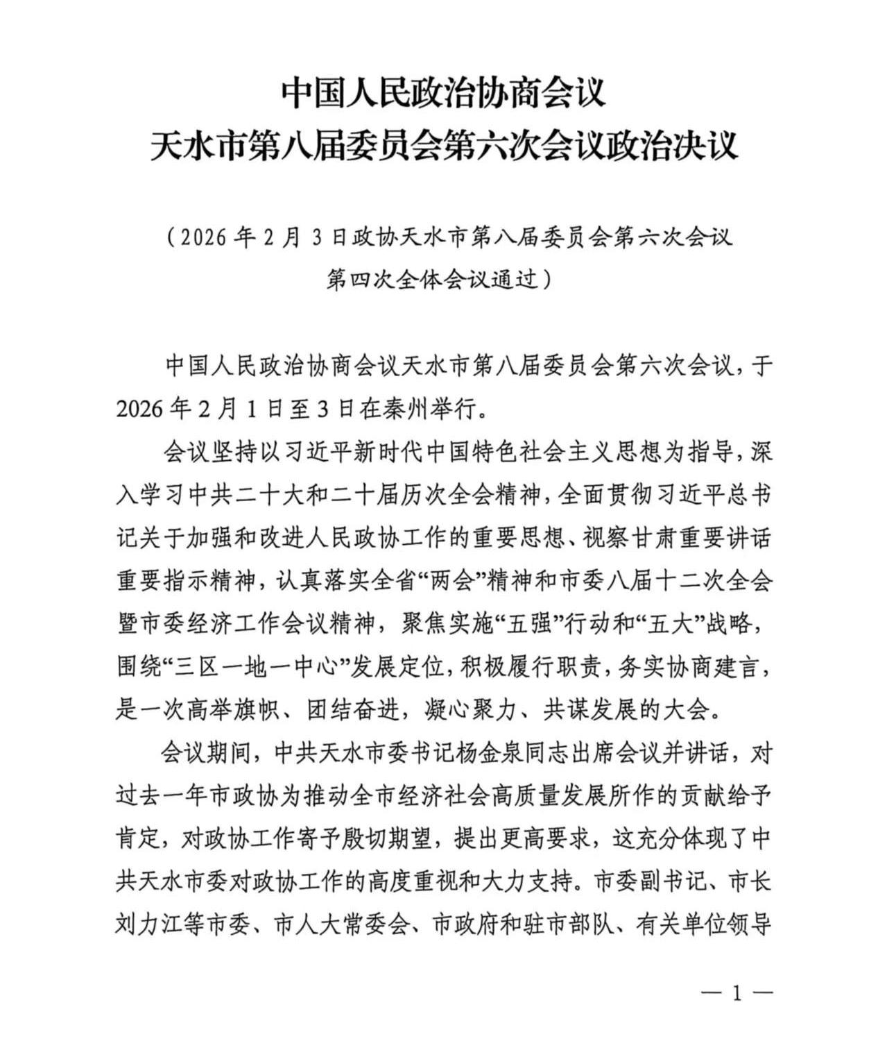 中国人民政治协商会议天水市第八届委员会第六次会议政治决议