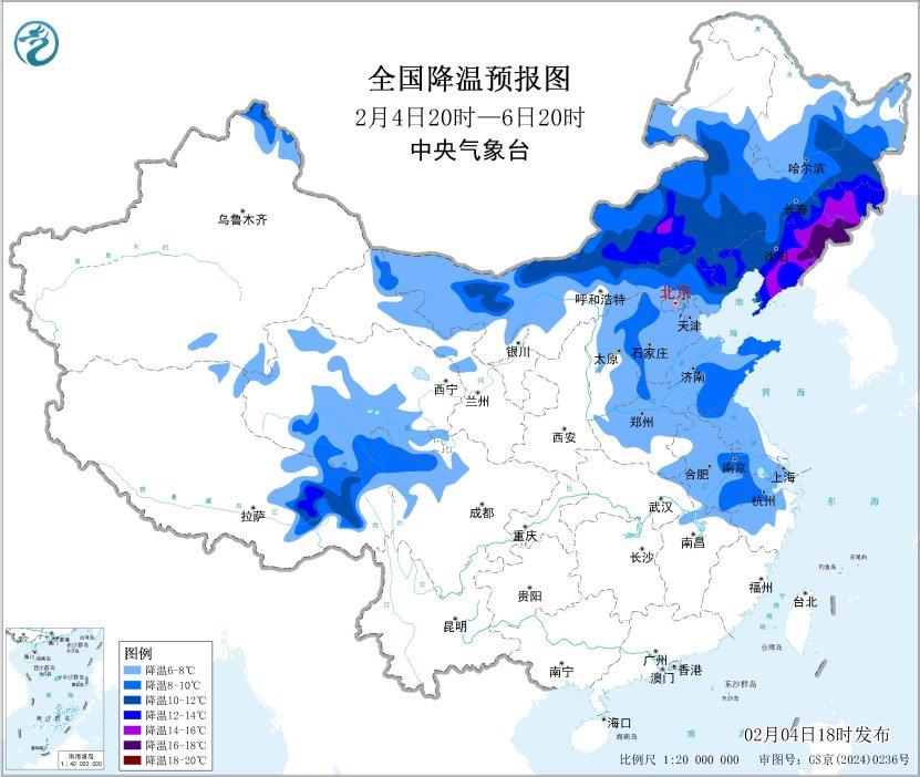 预计,2月4日20时至6日20时,内蒙古大部、东北地区大部、华北、黄淮、江淮、西藏东部等地将先后降温6~10℃,其中,内蒙古中部、东北地区东部等地部分地区降温可达12~16℃。