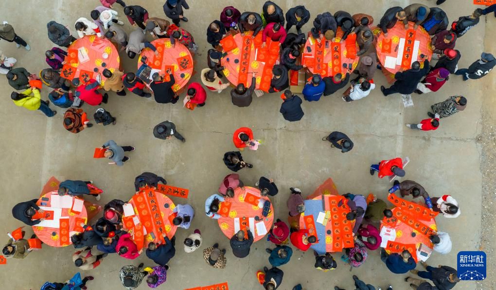 2月4日,在江西省宜春市樟树市经楼镇老农贸市场,专业书法老师为群众书写春联(无人机照片)。新华社发(周亮摄)