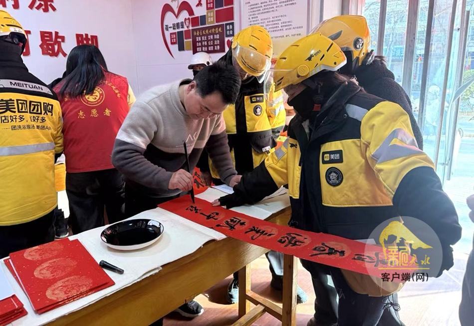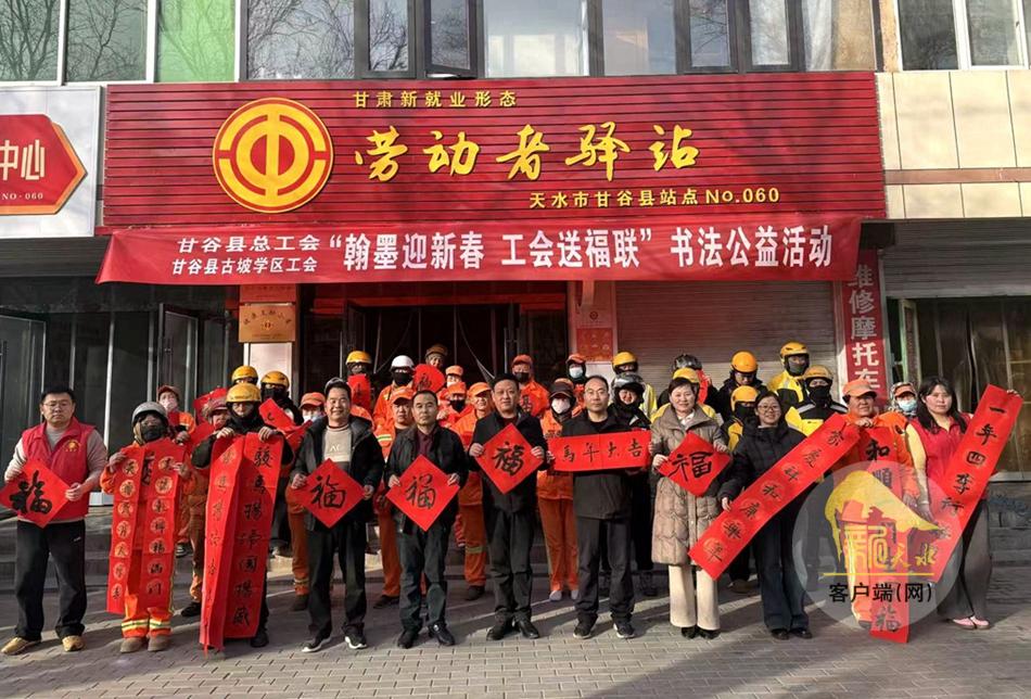 新天水讯 为弘扬中华优秀传统文化,丰富职工群众精神文化生活,营造欢乐祥和的节日氛围,2月6日,甘谷县总工会在新就业形态劳动者驿站开展“翰墨迎新春 工会送福联”书法公益活动,特邀古坡学区工会专业书法老师现场挥毫,为广大职工送上新春祝福。县总工会相关负责人、志愿者、户外劳动者及一线职工代表等50余人参加活动。