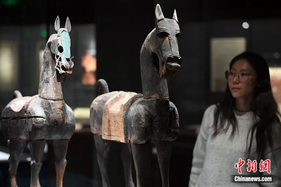 在甘肃省博物馆,由铜奔马领衔的一大批马文物,也成为近年游客打卡探秘的“明星”。如:闻名遐迩的中国古代邮驿形象魏晋《驿使图》壁画砖,生动展现了距今1600多年前,策马飞驰于古丝路上的邮驿情形;汉代最大木雕——彩绘木轺车,在两千年之后仍不失策马飞舆的雄健风姿;汉代铜车马仪仗俑队,则展现了汉代高级将领出行的赫赫威仪等。