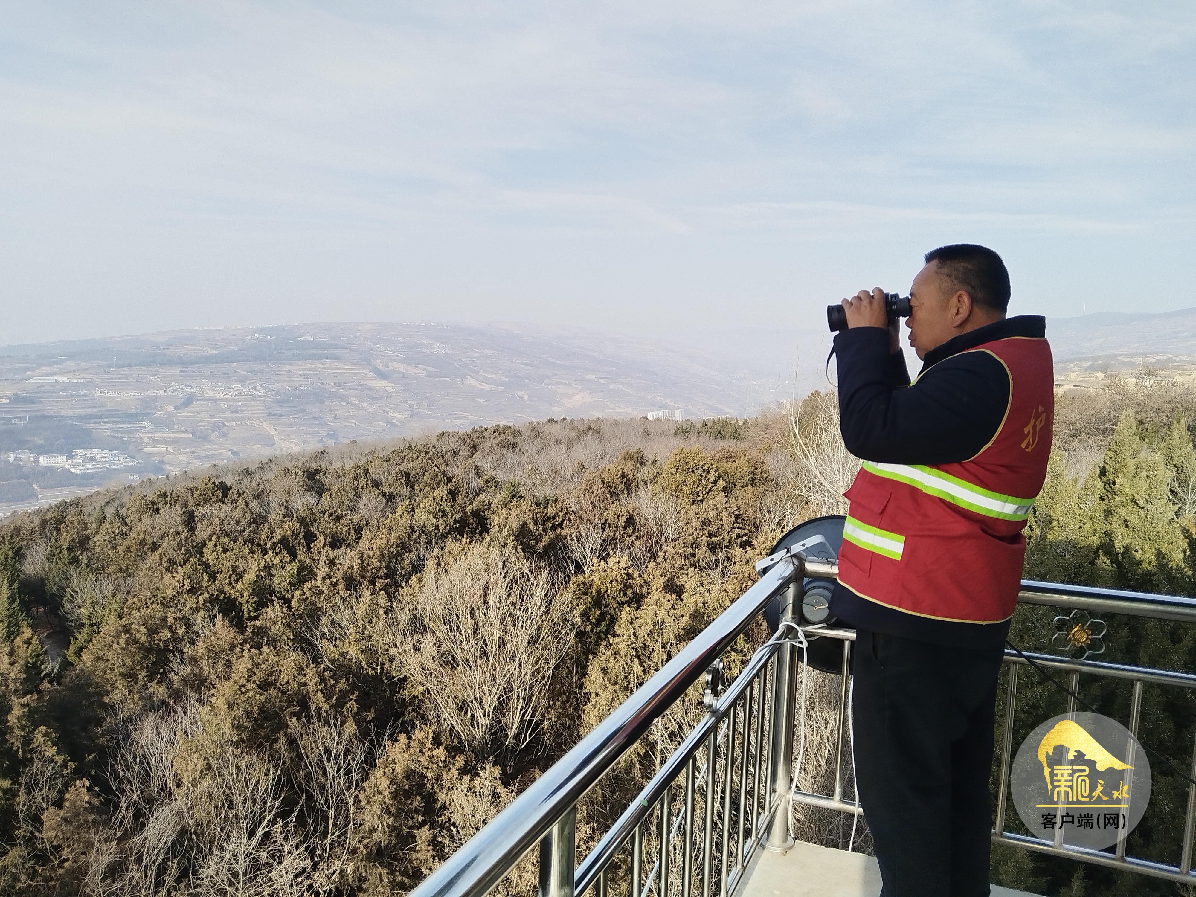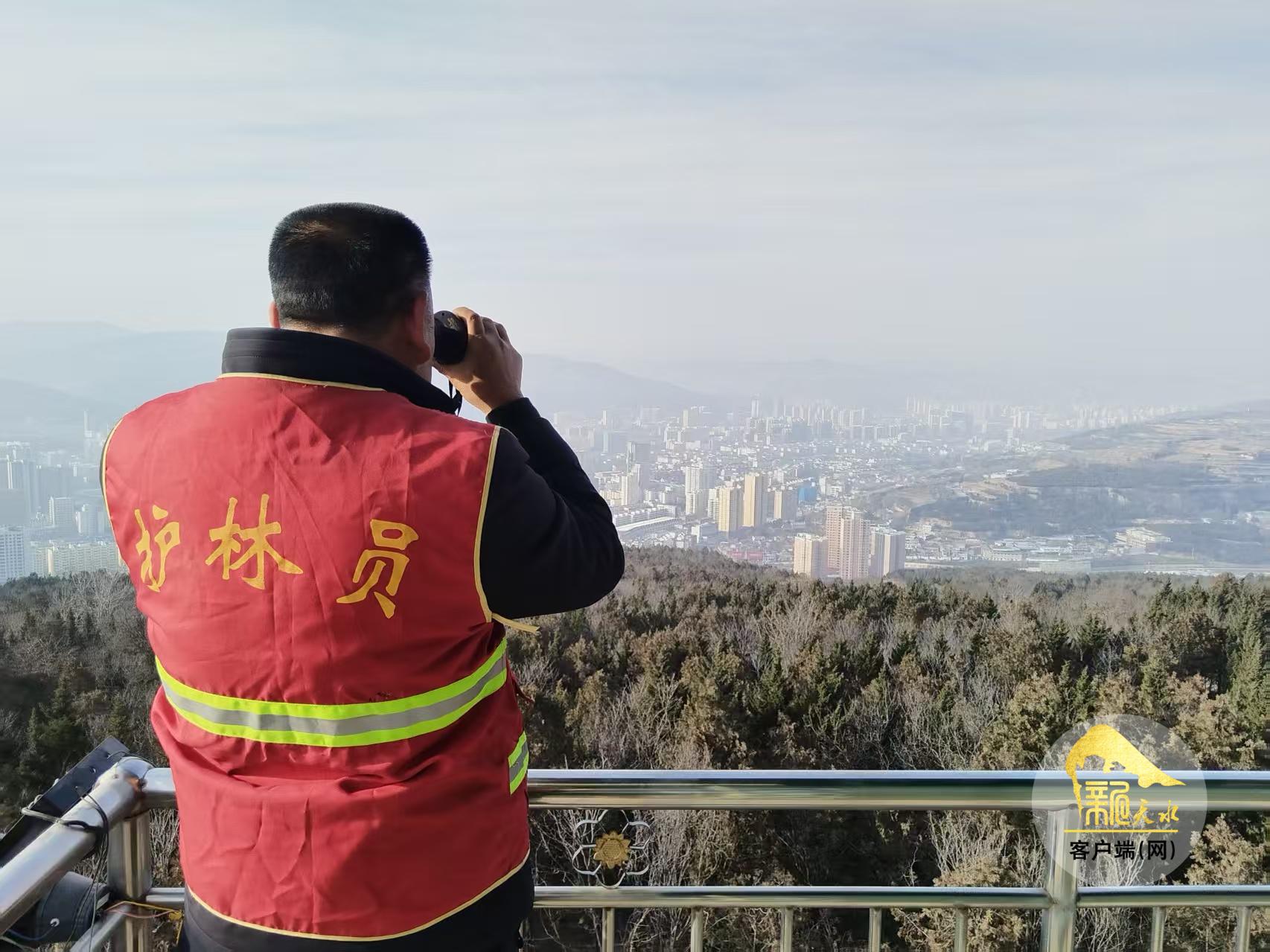 “进入林区,防火第一,共享森林美景,严防森林火灾……”2月13日,在秦州区北山林区重要路口,智能语音播报器循环播放着防火宣传语。不远处,皇城堡北山防火瞭望塔上,安装在塔顶的大喇叭也循环播放着防火宣传内容。护林员孟世存手持望远镜,对周围林区安全进行观测,护林员24小时轮流值守在瞭望塔上,确保林区防火安全。