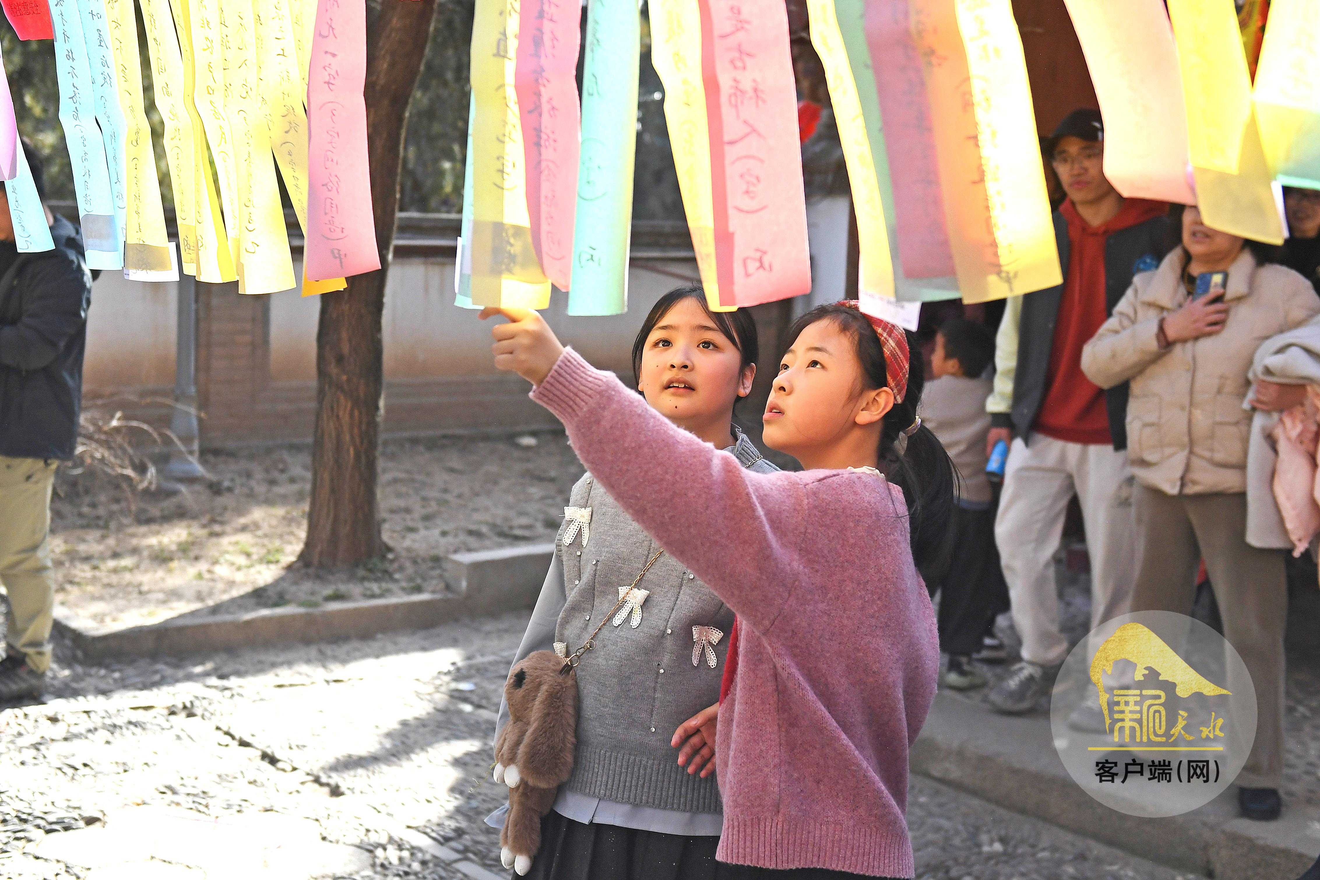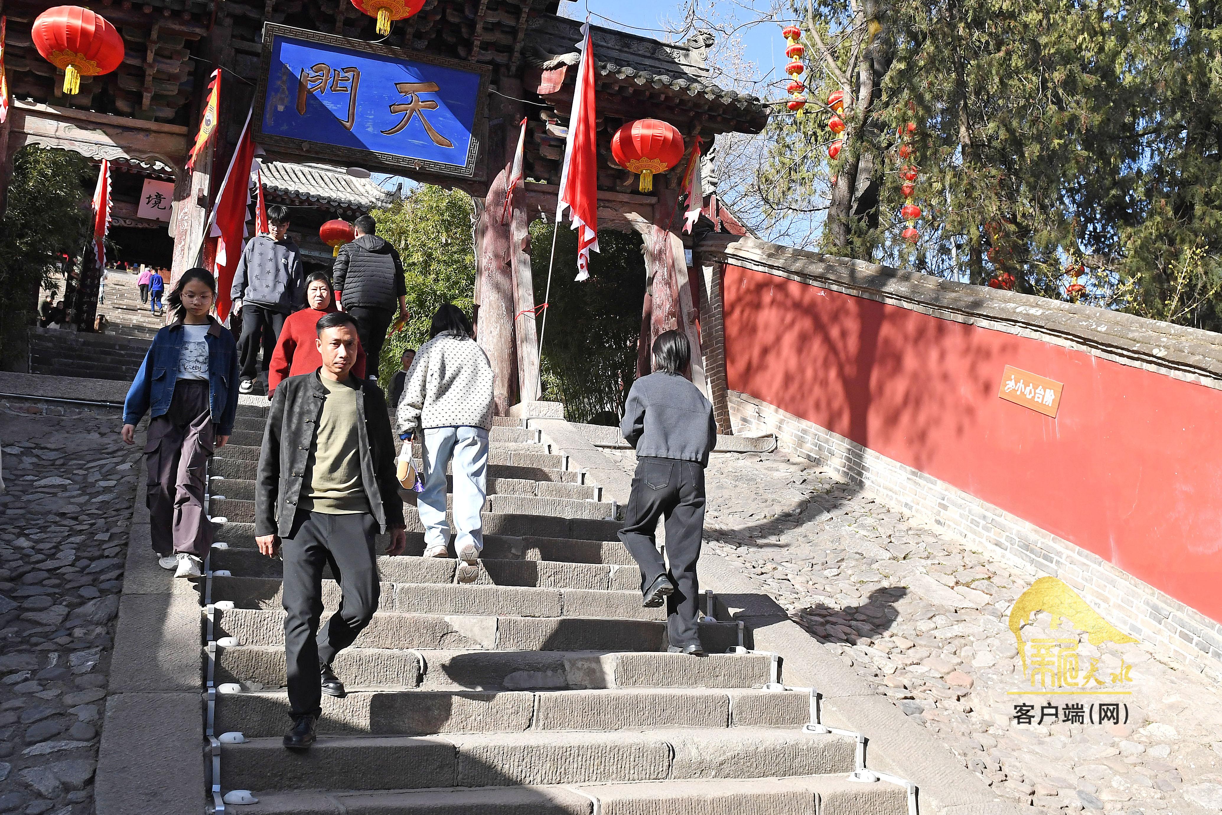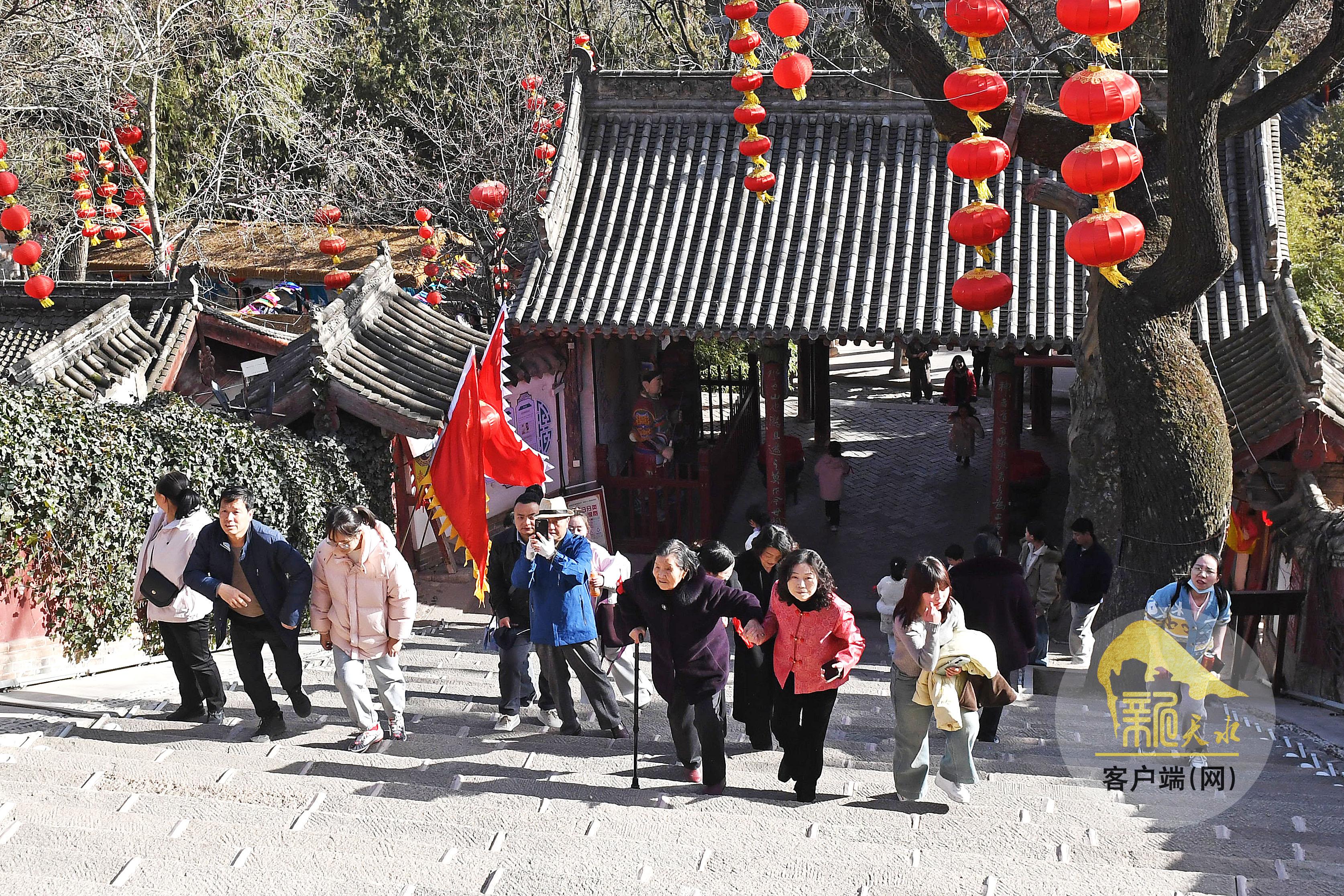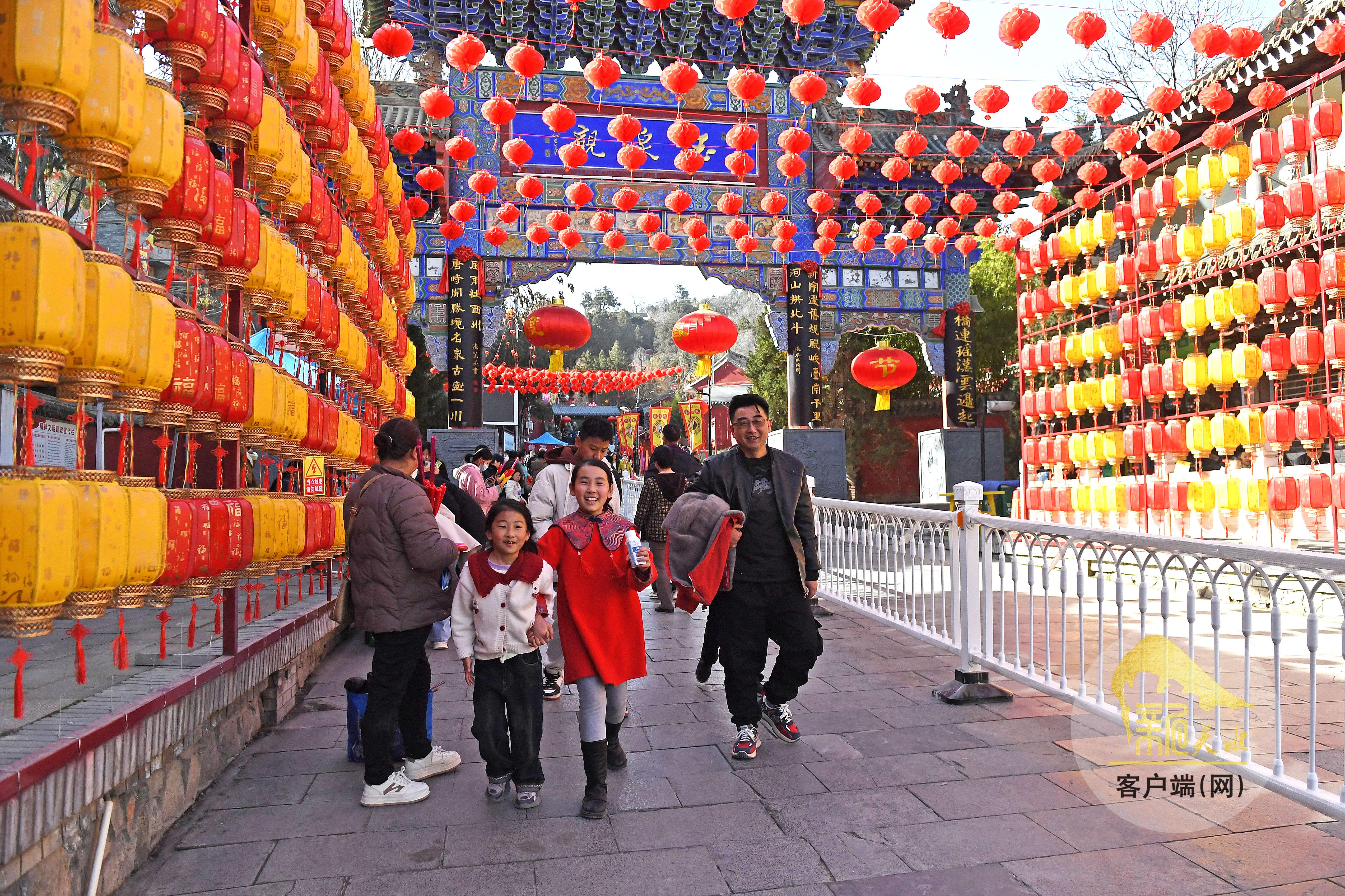 春节期间的玉泉景区灯笼高挂、彩旗招展。市民和游客纷纷参与民俗活动,沿着台阶游览玉泉观,系红绸、摸香炉、猜灯谜,祈求福运吉祥。