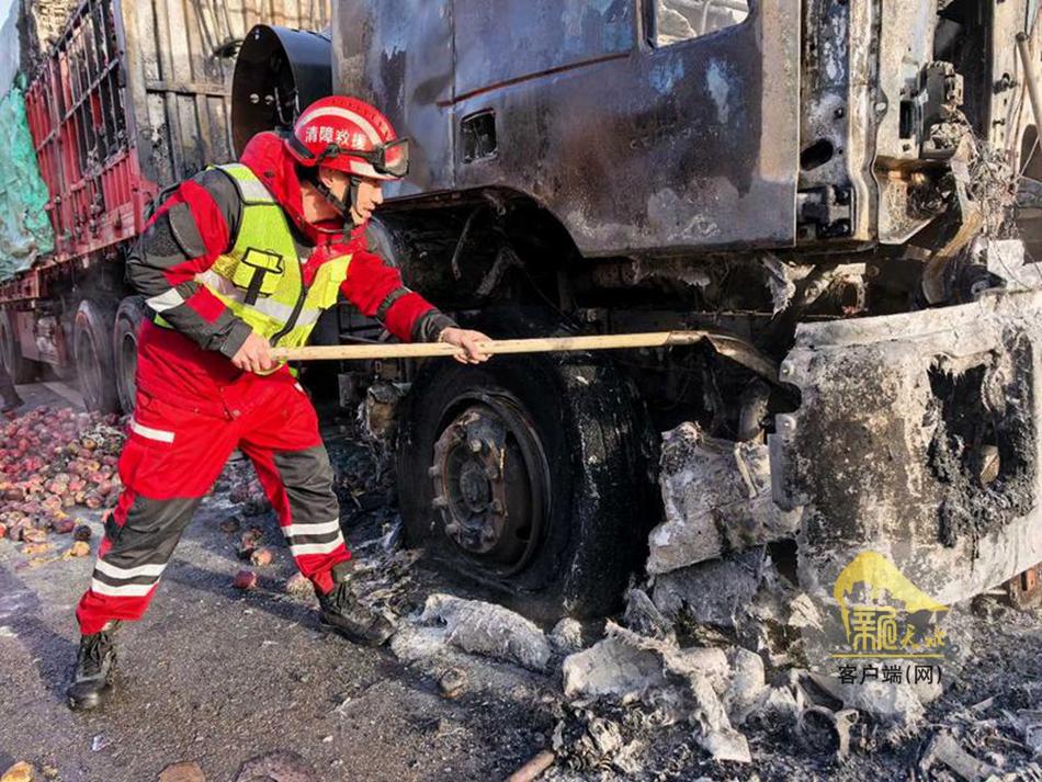 新天水讯 2月26日,一辆拉运苹果的半挂车行驶至宝天高速公路下行线K1303处时突发自燃,占用行车道及应急车道,现场情况十分紧急。面对险情,宝天隧道群管理中心快速响应,联合“一路多方”单位紧急处置,仅用2小时便恢复道路正常通行,用责任与速度筑牢了道路安全防线。