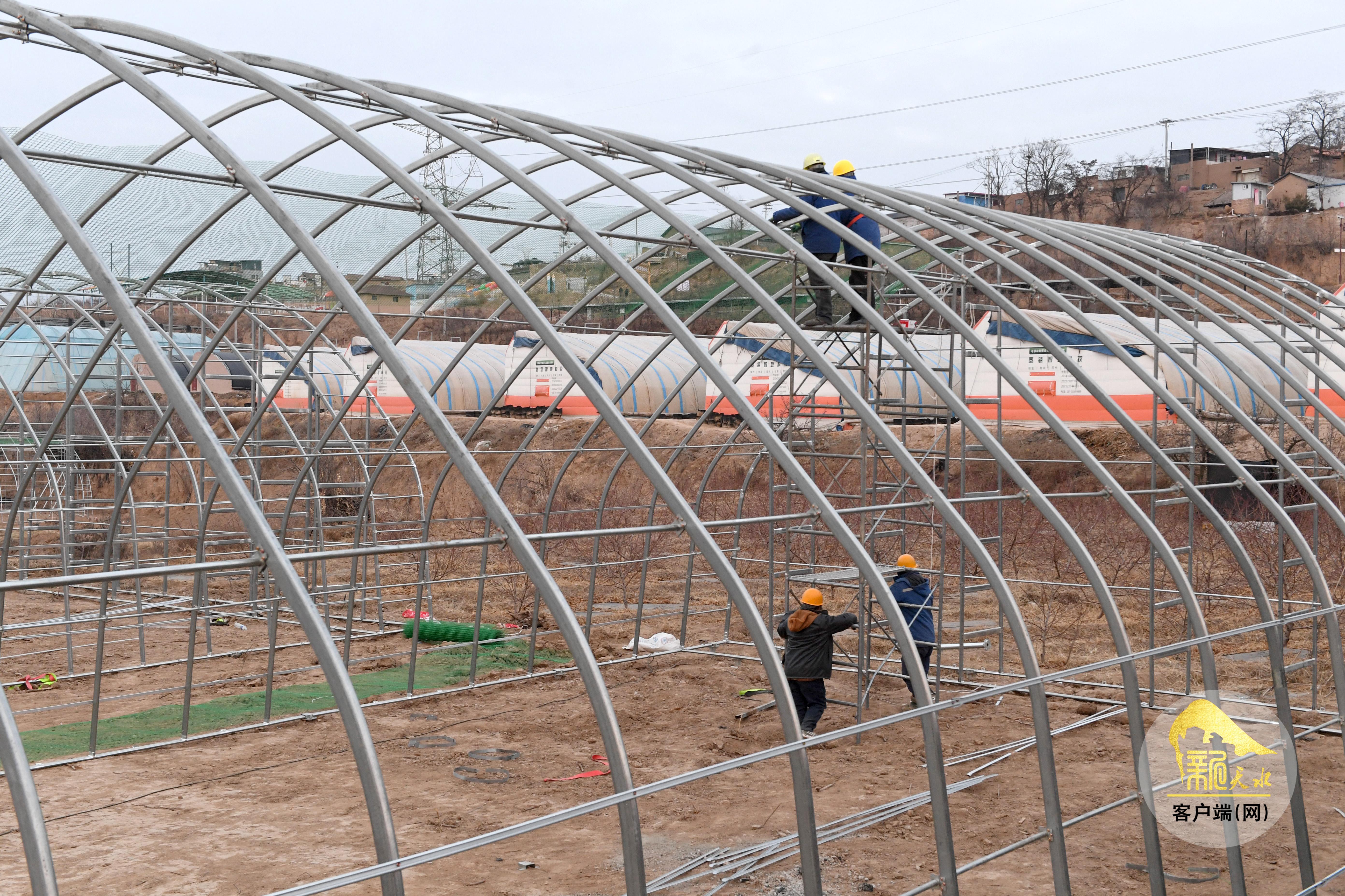 近日,天水市秦安县的蜜桃智慧农场正在建设日光温室。