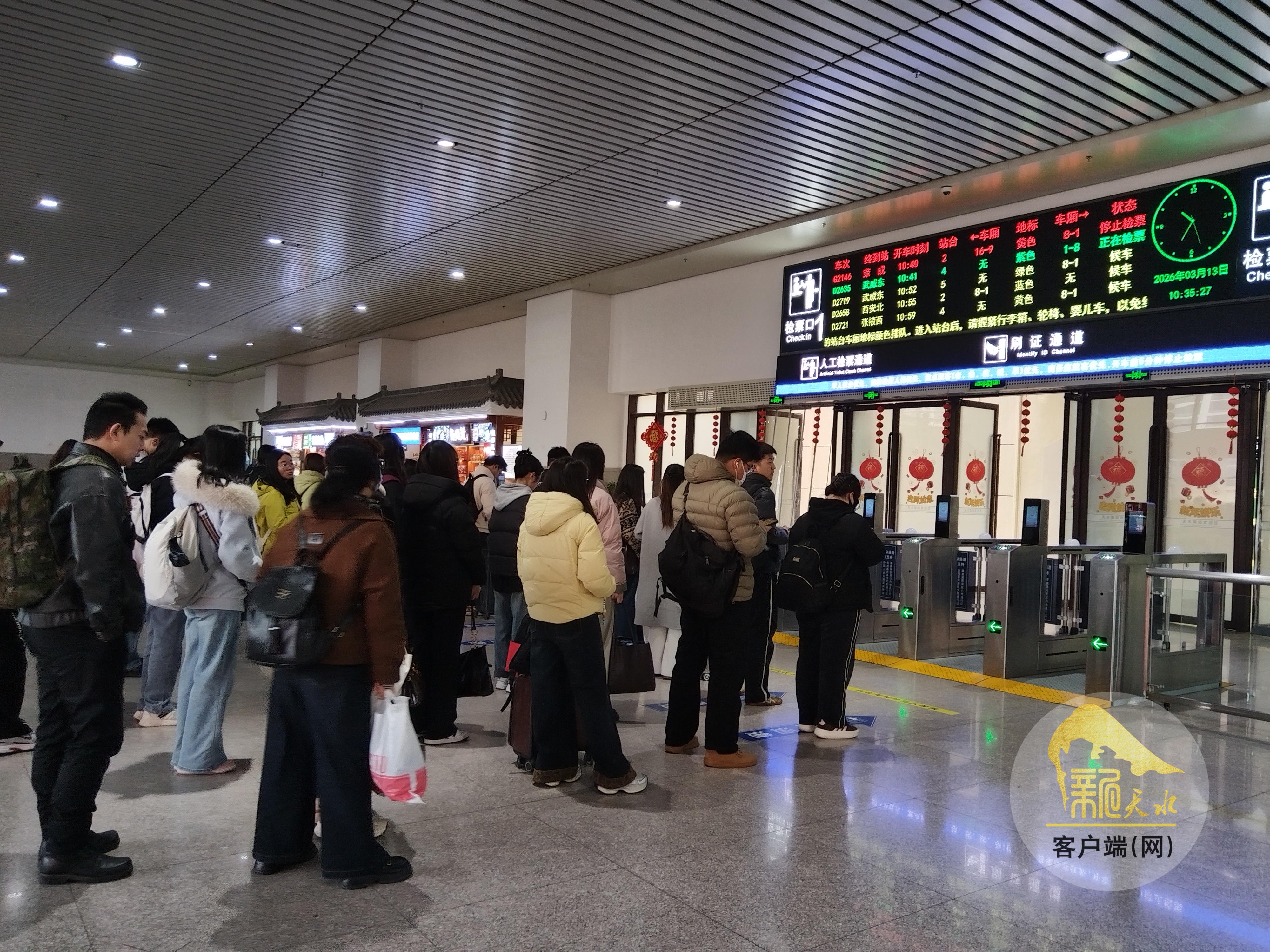 3月13日上午10时,记者来到天水南站,虽然是春运结束的最后一天,但是,候车大厅内依然有许多乘客等候检票进站。