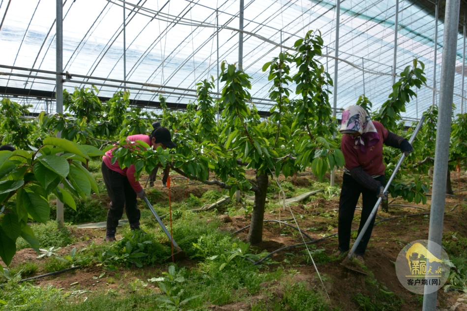 在秦州区杨家寺镇高山大樱桃种植基地,暖棚内绿意盎然。一排排樱桃树整齐排列,枝叶间已缀满黄豆般大小的幼果。工人们熟练开展疏花疏果、除草、摘心、病虫害防治等管护作业,每一道工序都细致规范。基地负责人李欣看着长势喜人的樱桃树,对今年丰产丰收信心满满。他介绍,基地从年初就精准调控棚内温度,保障樱桃树顺利开花坐果,目前坐果率稳定向好,若天气正常,4月中旬新鲜樱桃即可抢“鲜”上市。