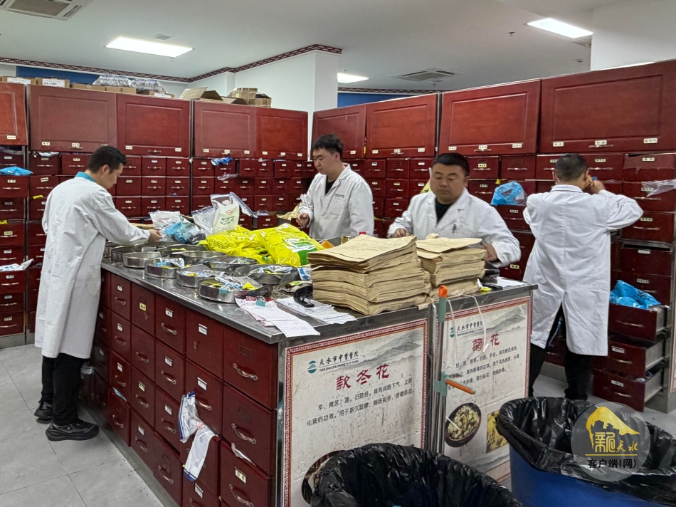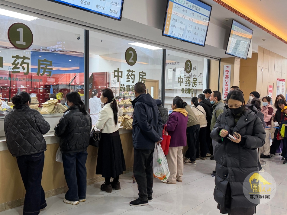 在中药房内,抓药调配的医护人员忙碌有序。针对风寒、风热、湿浊等不同症型,中药饮片分类清晰,调配师仔细核对药名与剂量,确保每一剂药精准到位。取药窗口前患者有序排队,领取药品。