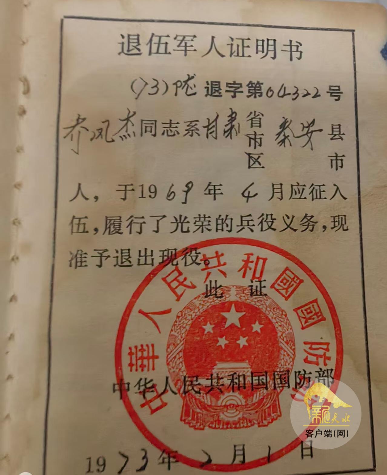 乔凤杰老人的退伍证。(受访者供图)