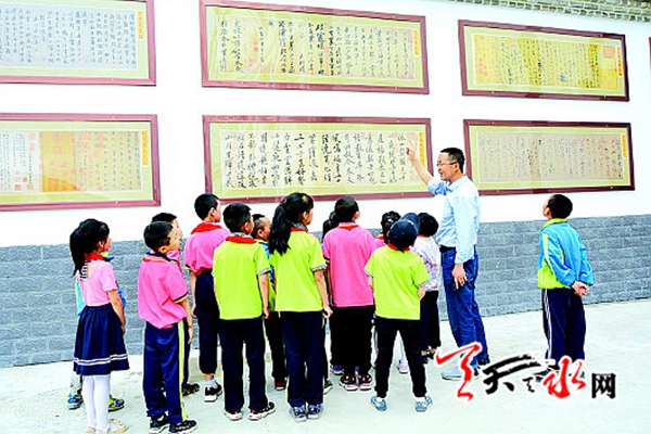 • 在武山县洛门中心小学的碑帖文化墙前,孩子们正聚精会神地听老师讲名帖、名碑[查看详情]
