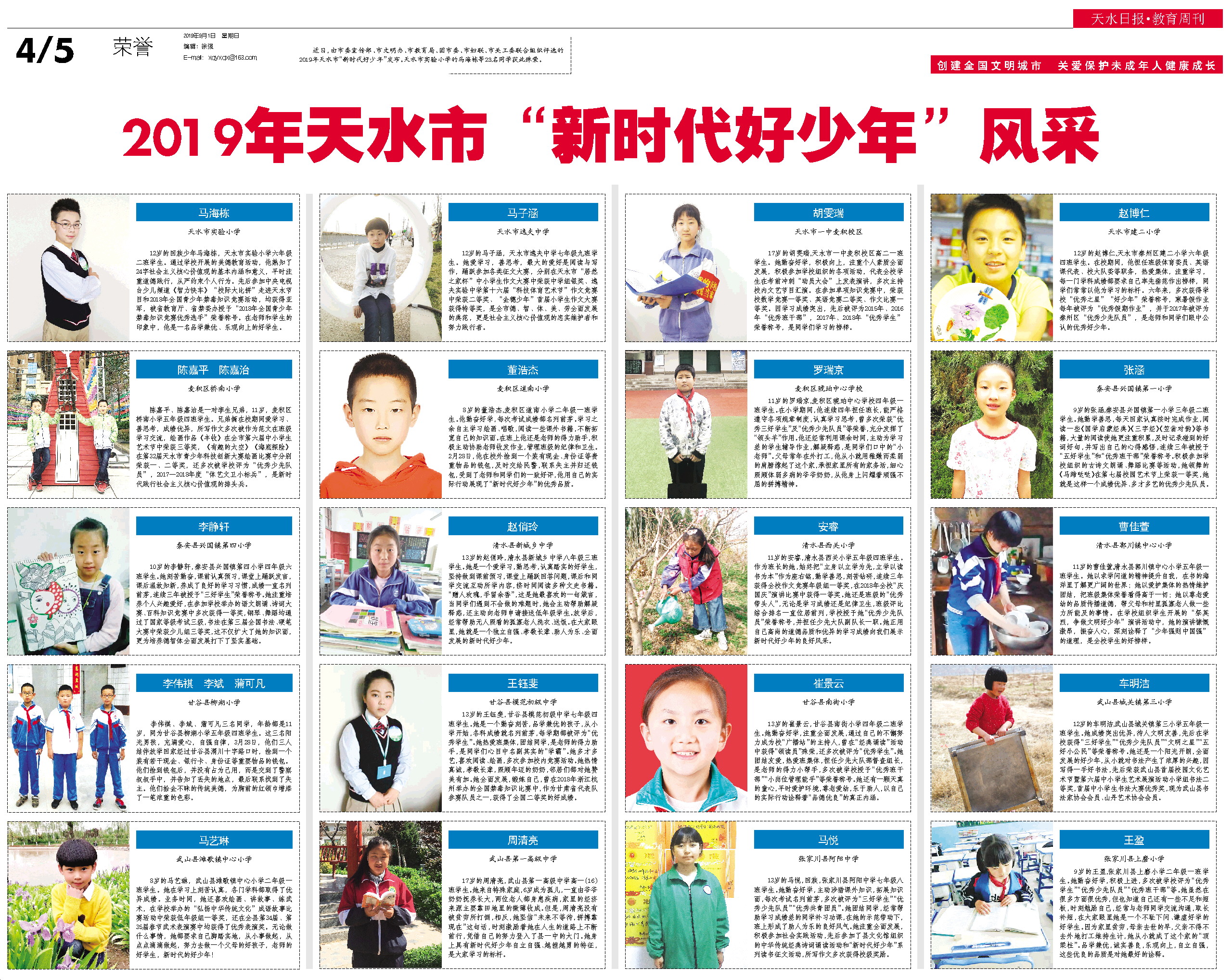 • 2019年天水市“新时代好少年”发布,天水市实验小学的马海栋等23名同学获此殊荣。[查看详情]