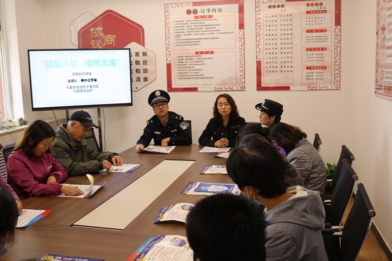 2020年10月10日上午,七里墩街道东十里社区邀请社区民警唐中正警官在社区道德讲堂里为辖区居民开展了一次“健康人生,绿色无毒”为主题的禁毒法律知识讲座,有50余人社区居民参加了此次活动。