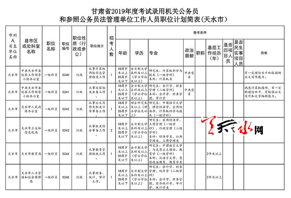 ![]() | 天水市2019年度考试录用机关公务员和参照公务员法管理单位工作人员通告 | 天水市2019年度考试录用机关公务员和参照公务员法管理单位工作人员通告 |
