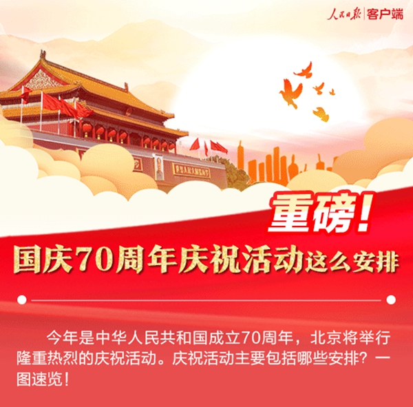 • 国庆70周年庆祝活动内容丰富,除阅兵式外,还有盛大的庆祝大会、群众游行,隆重的国庆招待会、颁授仪式,精彩的文艺晚会、联欢活动,以及大型展览和烟火表演。[查看详情]