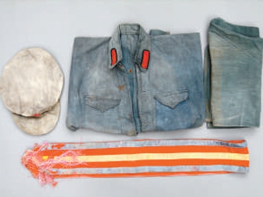 “上衣为中山装式,有两个上贴口袋,领口佩缀红领章;裤子为普通样式,配绑腿;军帽为八角帽,缀有布质红五角星帽徽。”