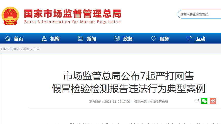 市场监管总局公布7起严打网售假冒检验检测报告违法行为典型案例