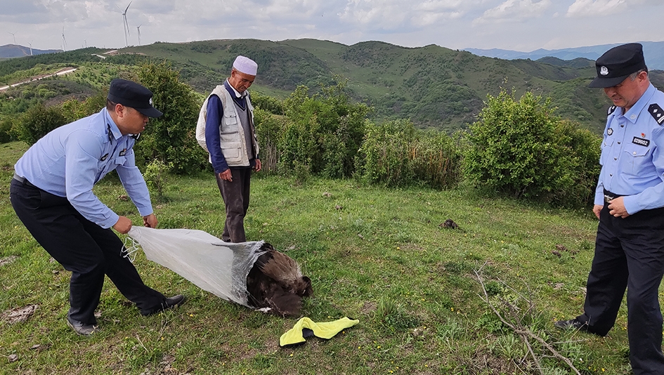 6月9日,张家川县公安局森林警察大队民警接110指令:在关山林区有一放牧群众发现疑似鹰类野生动物受困,需及时处警。