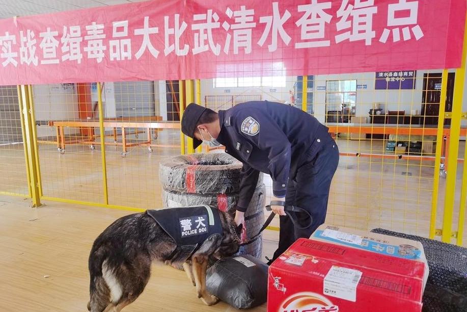 清水县公安局禁毒大队联动警犬大队、特巡警大队等对物流收寄验视、实名收寄及经营台账进行检查,并利用警犬对物流包裹进行了毒品检查。