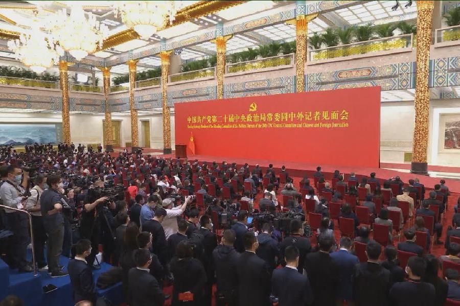 10月23日中午,在二十届一中全会上当选的中共中央总书记习近平和中共中央政治局常委首次集体亮相,同采访二十大的中外记者亲切见面。