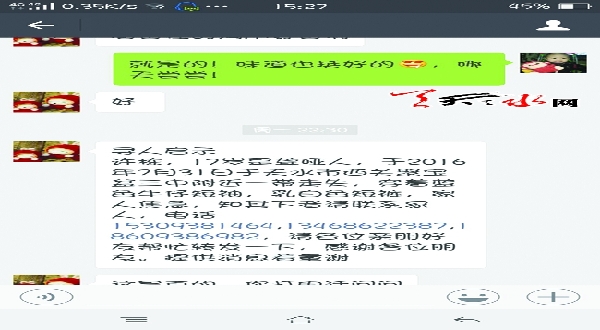 • 8月1日22时许,记者的微信朋友圈中出现了很多网友转发的一则寻人启事。为了证实真假,8月2日,记者来到秦州公安分局110指挥中心,一位工作人员看完后表示,这条寻人启事是真实的。[查看详情]