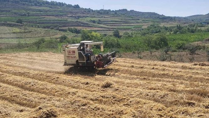 7月12日,正值盛夏,在王河镇的田间地头里呈现出一派丰收的景象,机器轰鸣,麦秸飞扬,收割机在金色麦田里来回穿梭,将粒粒饱满的小麦尽数收入“囊中”。