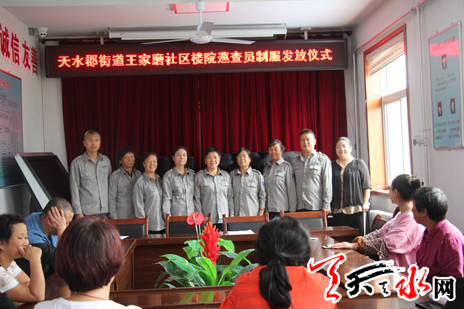 为了进一步加强和规范社区楼院巡查员管理,推动群防群治队伍建设,9月6日上午,天水郡街道王家磨社区将区委政法委配发的9套崭新的巡查制服发放到社区楼院巡查员的手中,并举行了发放仪式。