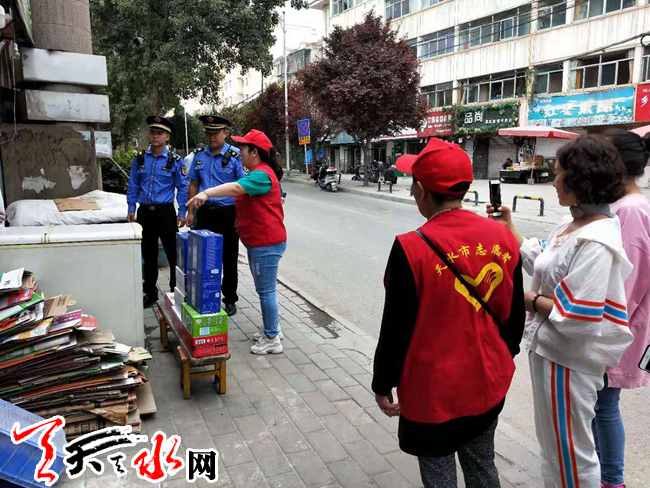 行动中志愿者们对忠义巷乱堆乱放的杂物、花园中的杂草进行了清理,对居民院落的周边垃圾、乱停乱放及僵尸车进行了清运整治。