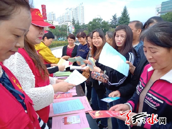 9月27日上午,秦州区七里墩街道五里铺社区利用横幅、禁毒宣传画报、宣传册、现场讲解等形式,在市中心血站广场开展了禁毒宣传活动。