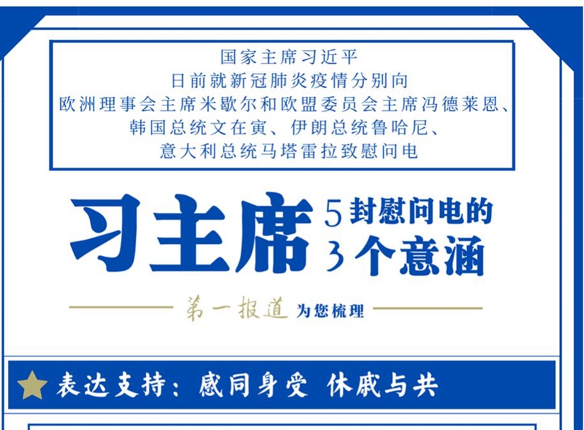 习近平主席日前就新冠肺炎疫情分别向欧洲理事会主席米歇尔和欧盟委员会主席冯德莱恩、韩国总统文在寅、伊朗总统鲁哈尼、意大利总统马塔雷拉致慰问电。