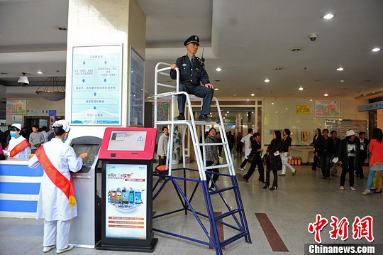 3月26日,云南省第一人民医院门诊部收费处附近摆放了两把高近3米的“瞭望凳”,保安坐在上面,居高临下提醒排队等候挂号、取药的患者小心被盗。这是昆明公安局借鉴外省警方经验,在昆明首创的“瞭望凳”防小偷新举措。