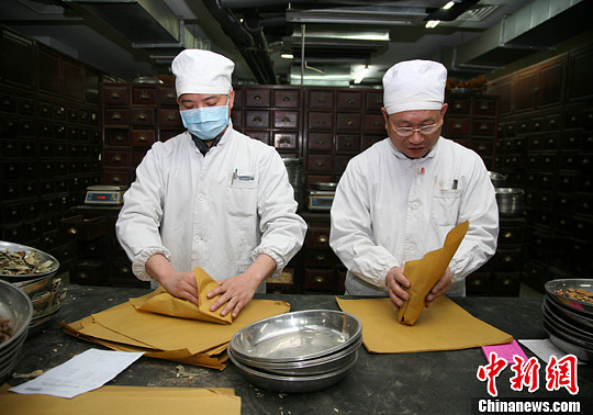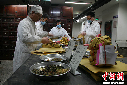 4月7日,记者在浙江省中医院中药房内发现,医师们正在配置中药。中新社发 李晨韵 摄